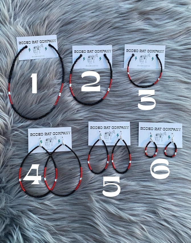 Tear hoops are made from black, red and white glass beads. Strung on beading wire with ear wire for closure.