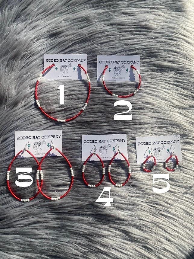 Tear hoops are made from red and white glass beads. Strung on beading wire secured with ear wire for closure.