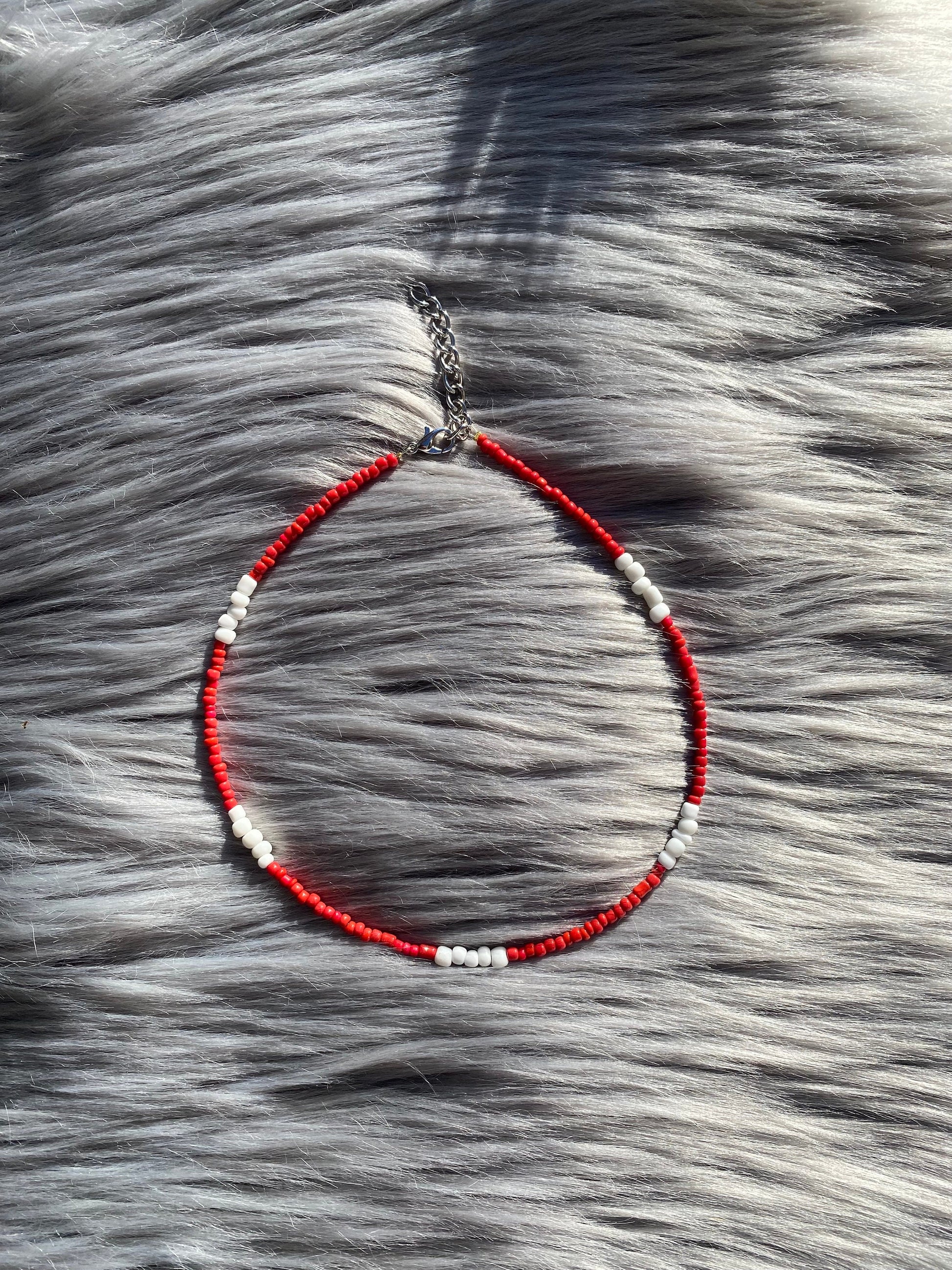 Choker and anklet are made from red and white glass beads. The white beads are a larger diameter than the red to add texture to the pieces. Strung on beading wire secured with clamp beads. Adjustable length is thanks to high quality jewelry chain and closure consists of a lobster claw clasp.