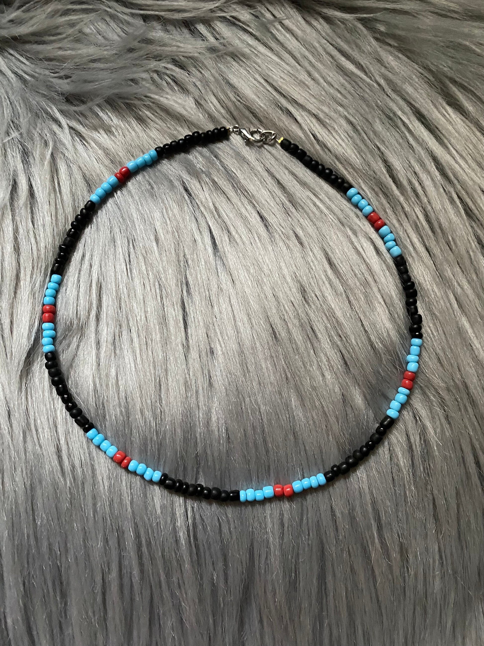 Necklace, choker and anklet are made from black, baby blue and red glass beads. Strung on beading wire secured with clamp beads. Closure consists of a lobster claw clasp and adjustable length is thanks to high quality jewelry chain.
