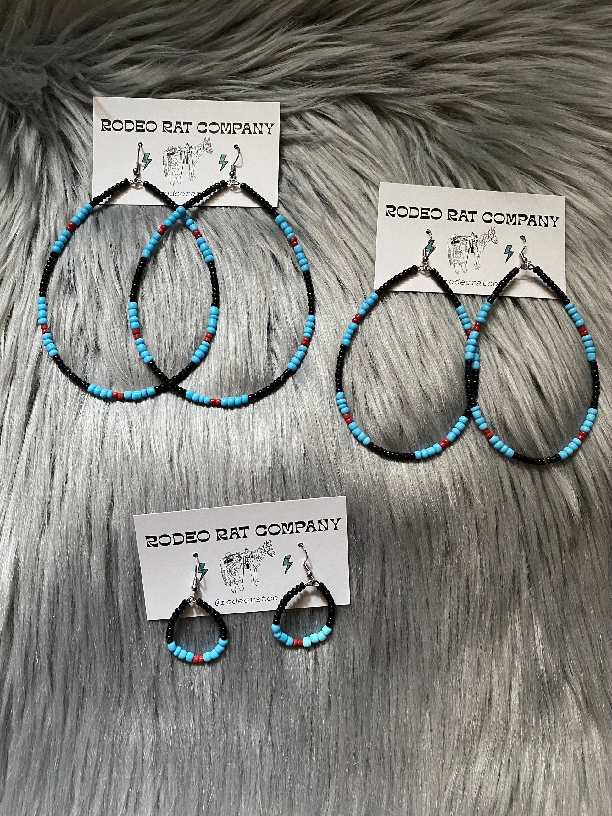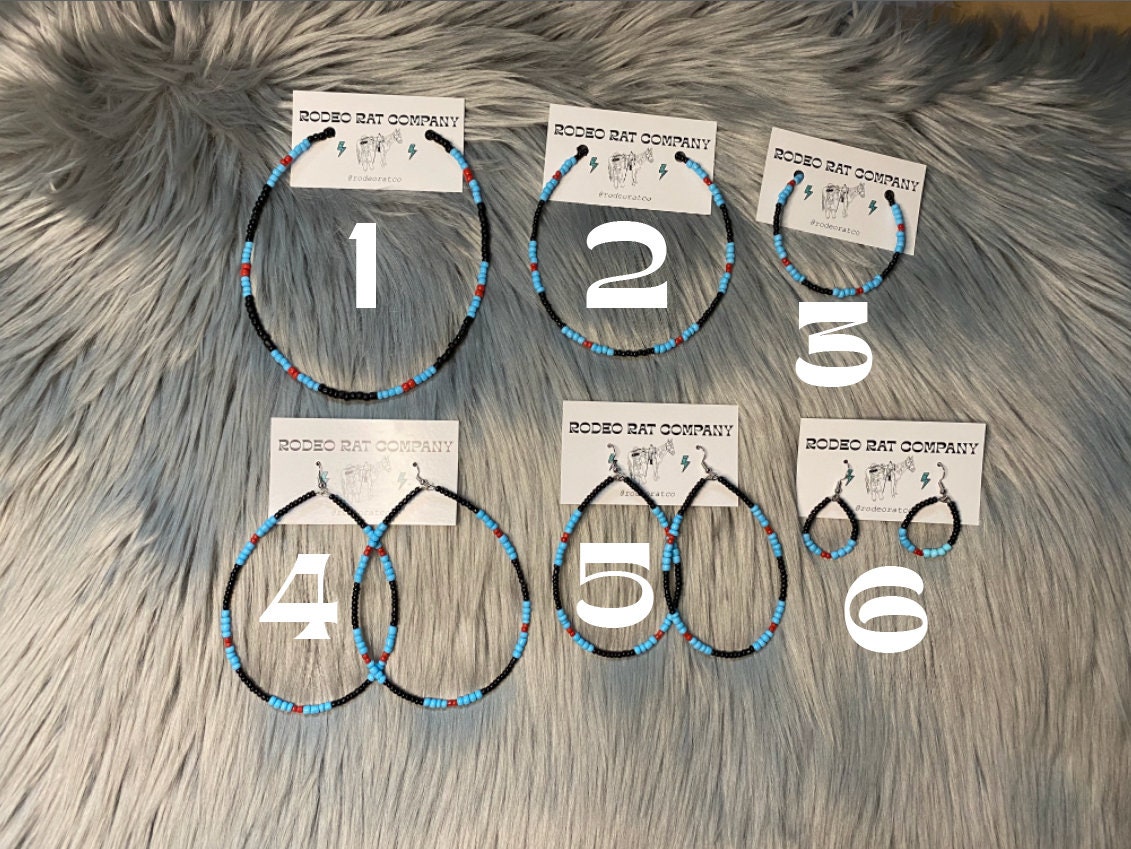 Tear Hoops are made from black, baby blue and red glass beads. Strung on beading wire secured with ear wire for closure.