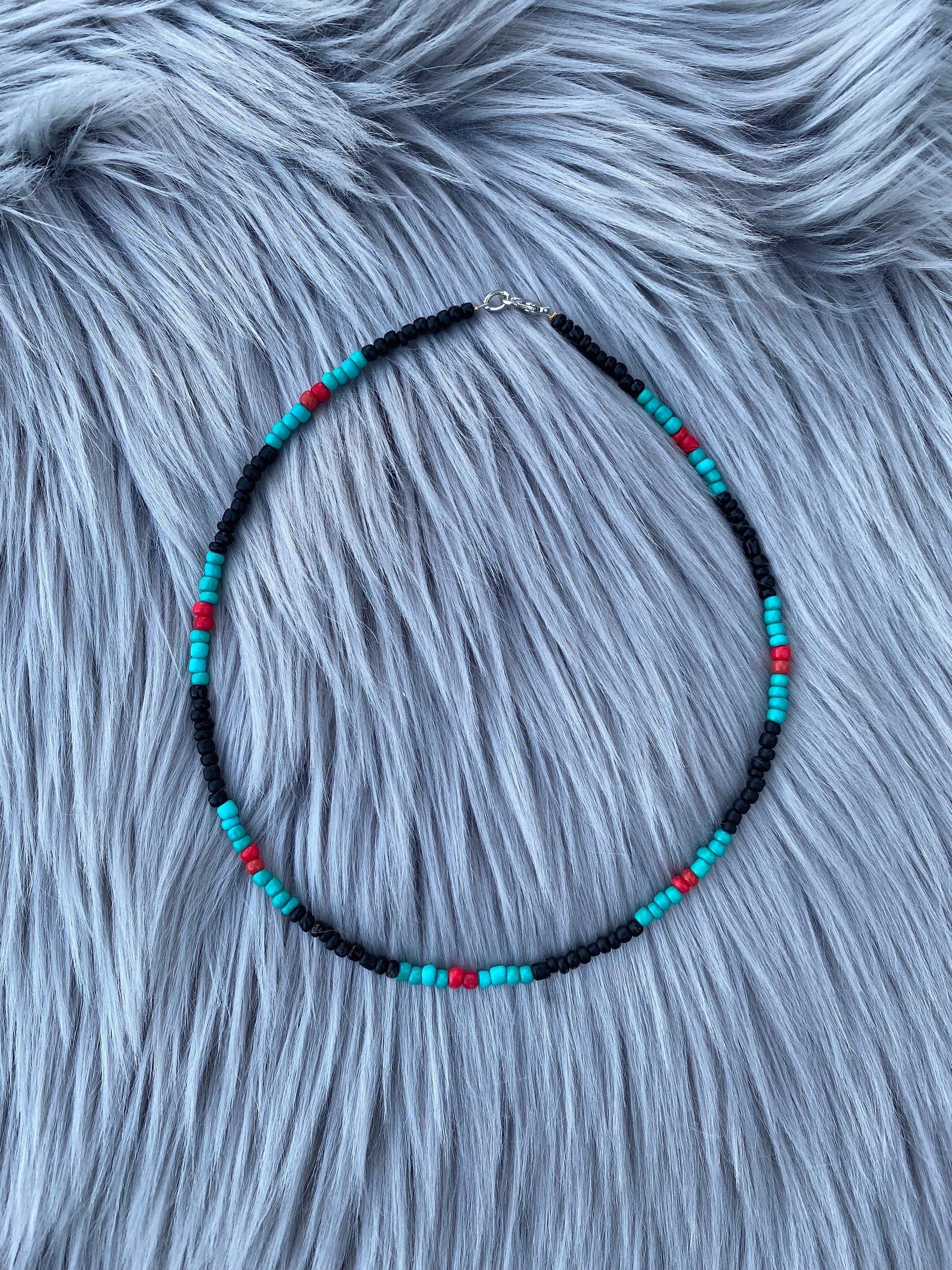 Necklace, choker and anklet are made from black, turquoise and red glass beads. Strung on beading wire secured with clamp beads. Closure consists of a lobster claw clasp and adjustable length is thanks to high quality jewelry chain.