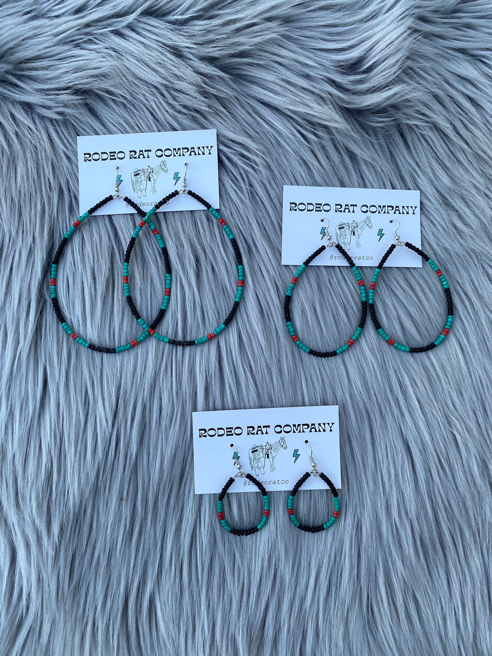 Tear hoops are made from black, turquoise and red glass beads. Strung on beading wire secured with ear wire for closure.