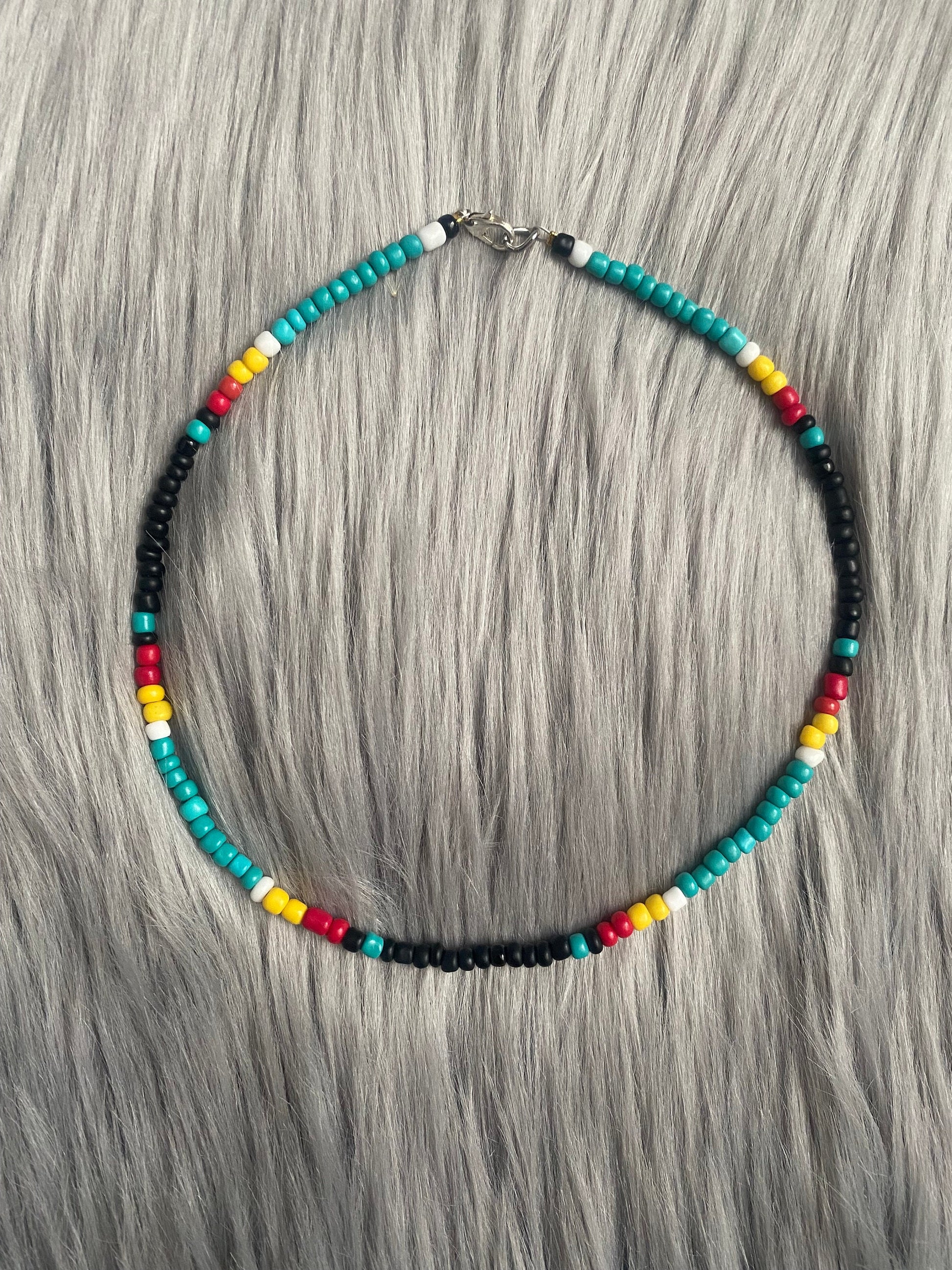 Necklace, choker and anklet are made from black, white, yellow, red and turquoise glass beads strung on beading wire secured with clamp beads. Closure consists of a lobster claw clasp and adjustable length is thanks to high quality jewelry chain.