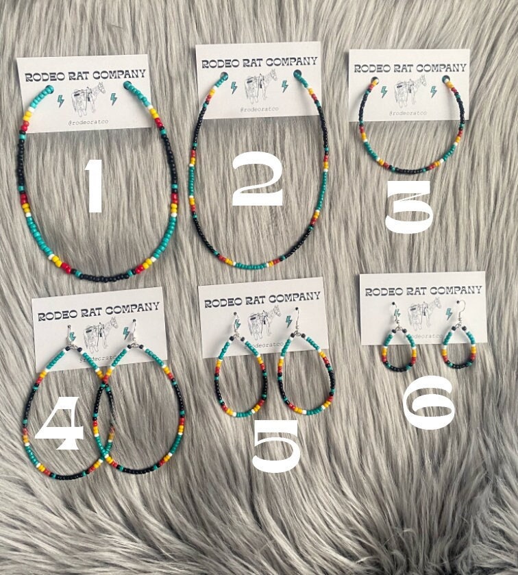 Tear hoops are made from black, white, yellow, red and turquoise glass beads. Strung on beading wire and secured with ear wire for closure.