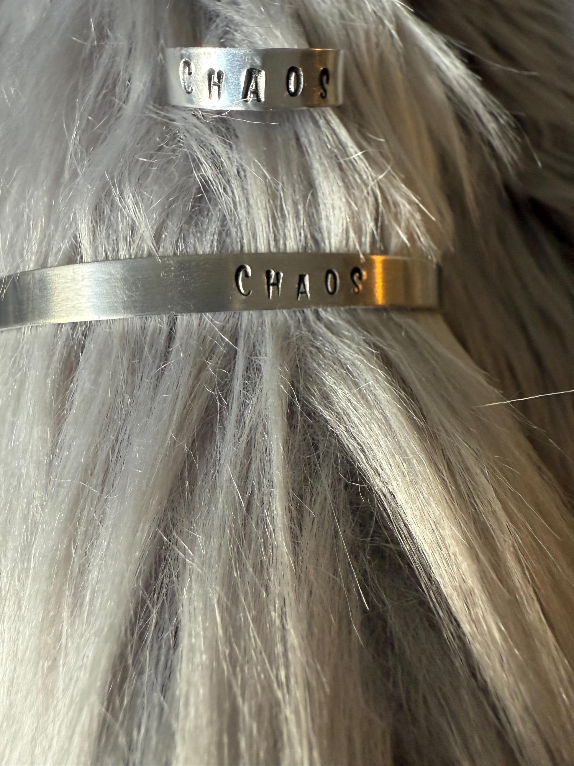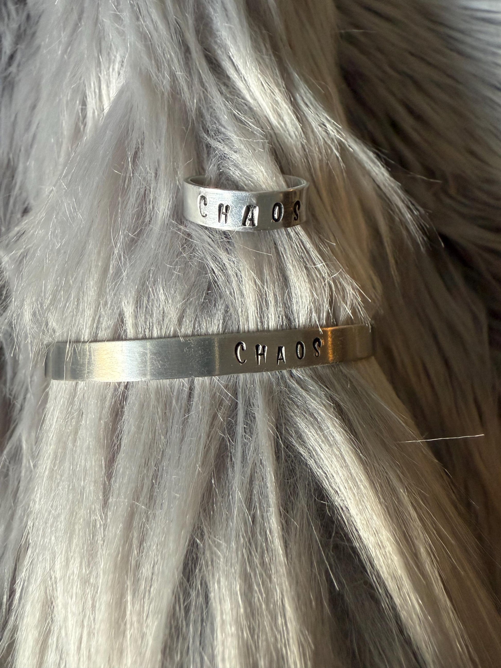 Bracelet and ring are made from stainless steel with the hand stamped word “Chaos” on them. Pieces are bendable so you can adjust them to fit you the way you’d like!