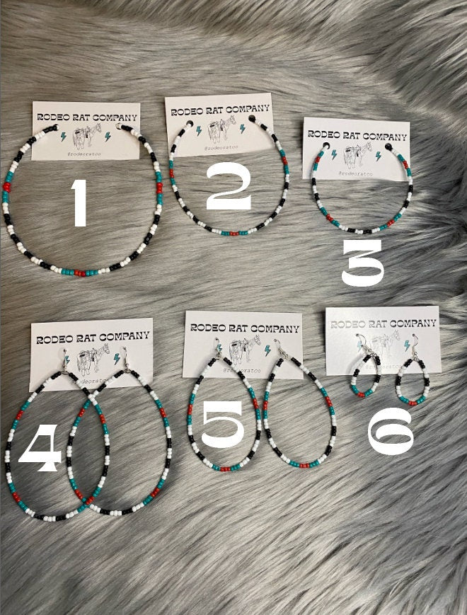 Our “Crow Lilly” pattern comes in a necklace, choker, anklet, large tear hoops, medium tear hoops, small tear hoops and a jewelry set. This pattern is inspired by a horse I once owned named “Lilly”. Lilly is a big bay mare who had a sweet dog attitude. She had a bad habit of crow hopping. Hence the name and pattern Crow Lilly was born. She has since been sold and is doing much better in a home with a rider she gets along with more.
