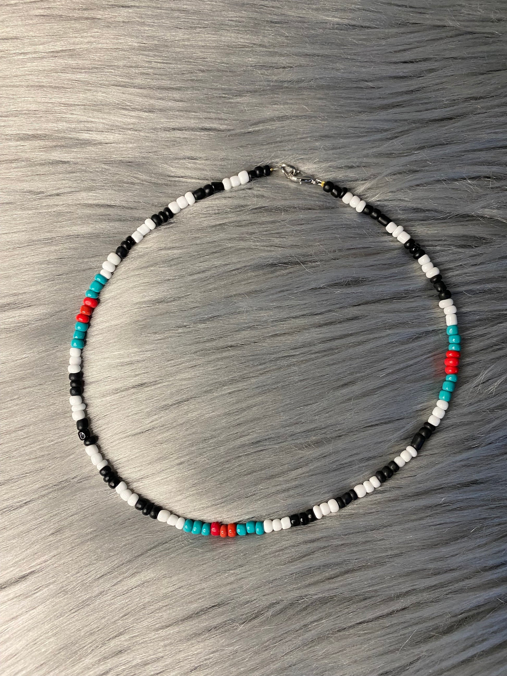 Necklace, choker and anklet are made from black, white, red and turquoise glass beads. Strung on beading wire secured with clamp beads. Closure consists of a lobster claw clasp and adjustable length is thanks to high quality jewelry chain.