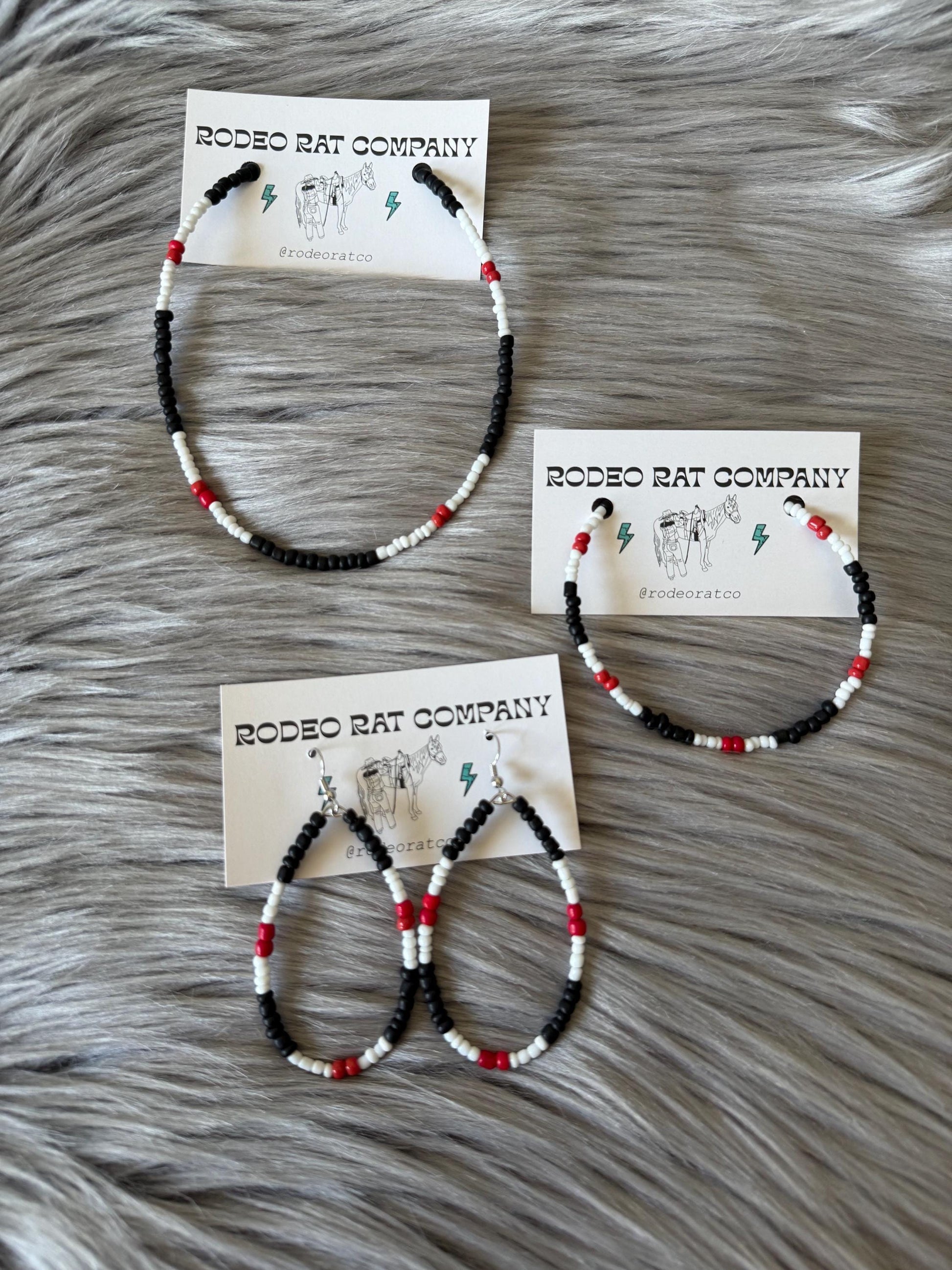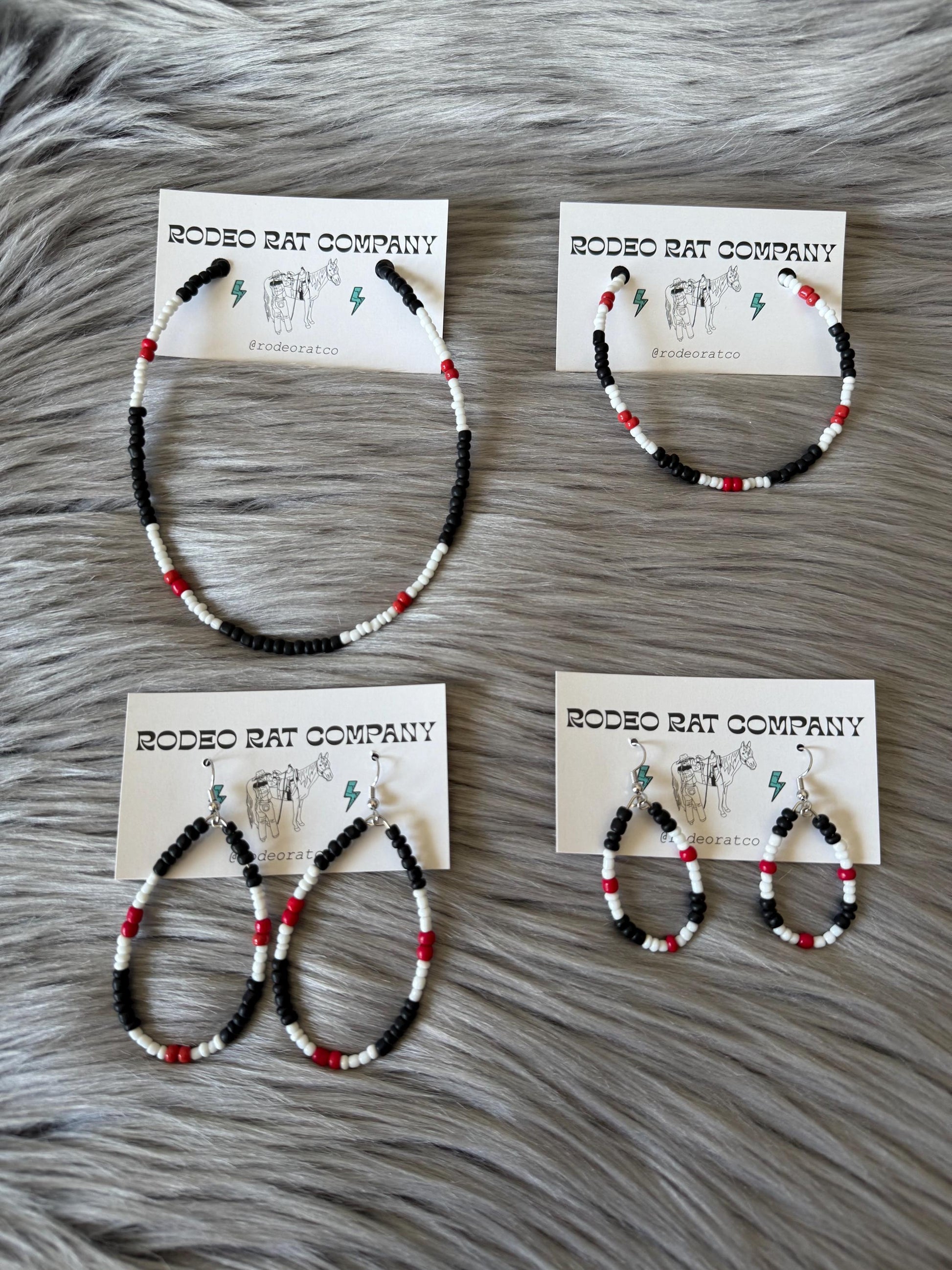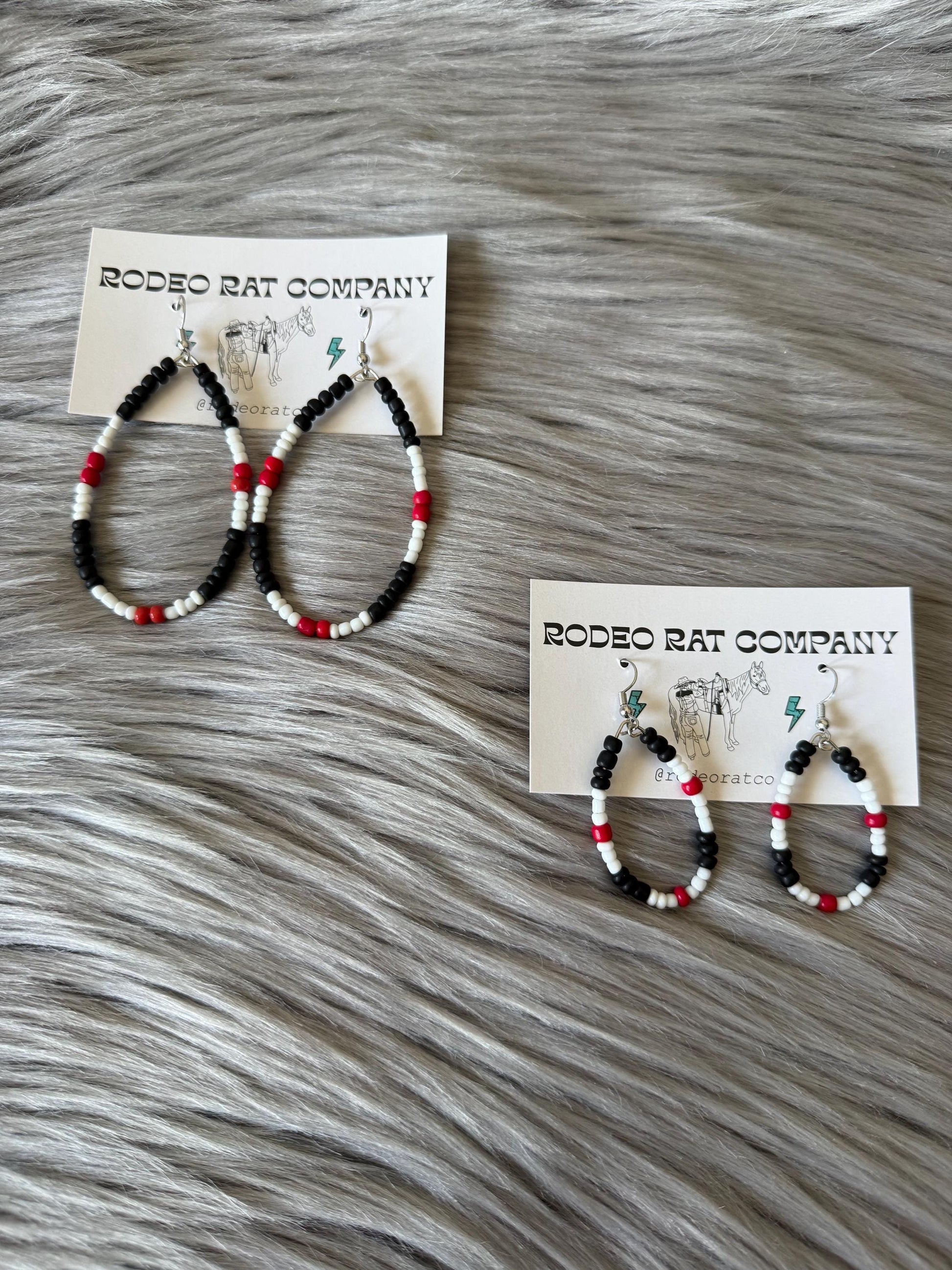 Tear Hoops are made from black, red and white glass beads. Strung on beaded wire secured with ear wire for closure.