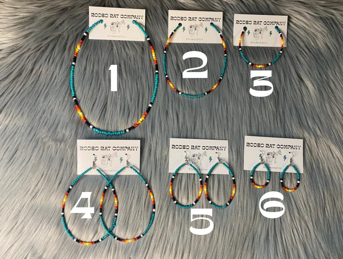 Our “Full Throttle” jewelry pattern comes in a necklace, choker, anklet, large tear hoops, medium tear hoops, small tear hoops and a jewelry set.