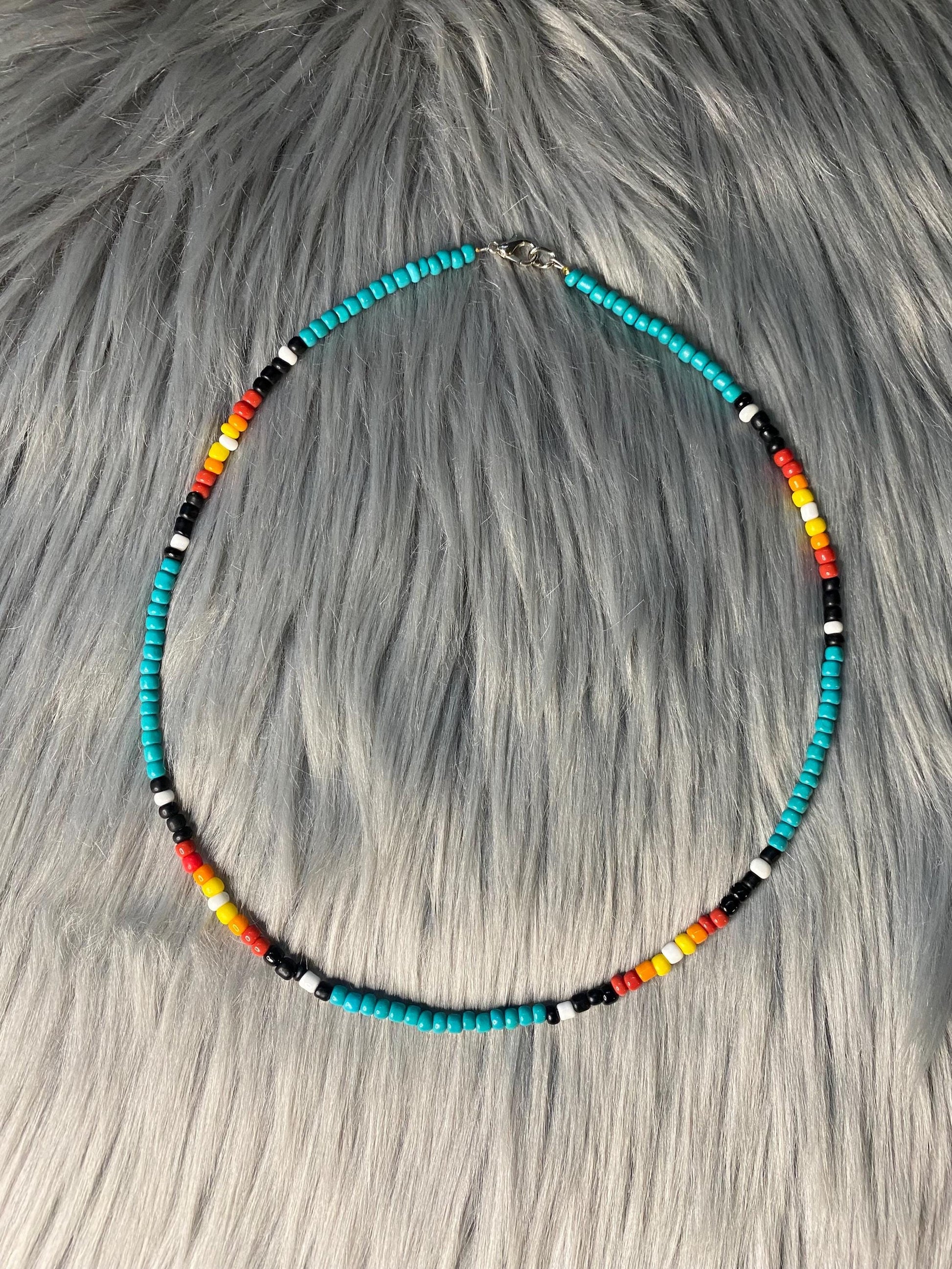 Necklace, choker and anklet are made from turquoise, black, white, red, orange and yellow glass beads. Strung on beading wire secured with clamp beads. Closure consists of a lobster claw clasp and adjustable length is thanks to high quality jewelry chain.