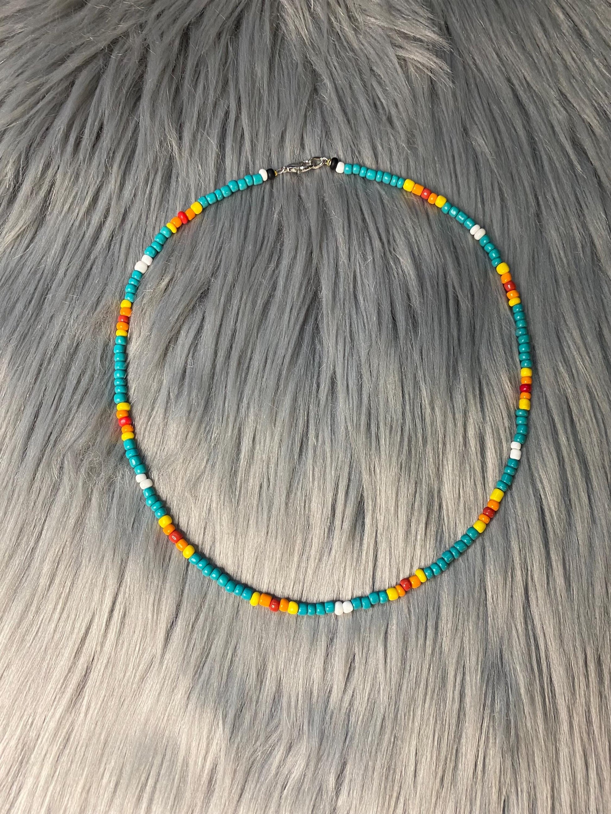 Necklace, choker and anklet are made from white, black, turquoise, yellow, orange and red glass beads. Strung on beading wire secured with clamp beads. Closure consists of a lobster claw clasp and adjustable length is thanks to high quality jewelry chain.