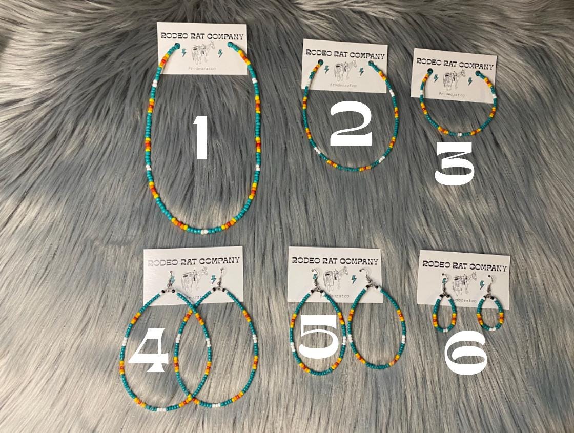Tear hoops are made from black, white, turquoise, yellow, orange and red glass beads. Strung on beading wire secured with ear wire for closure.