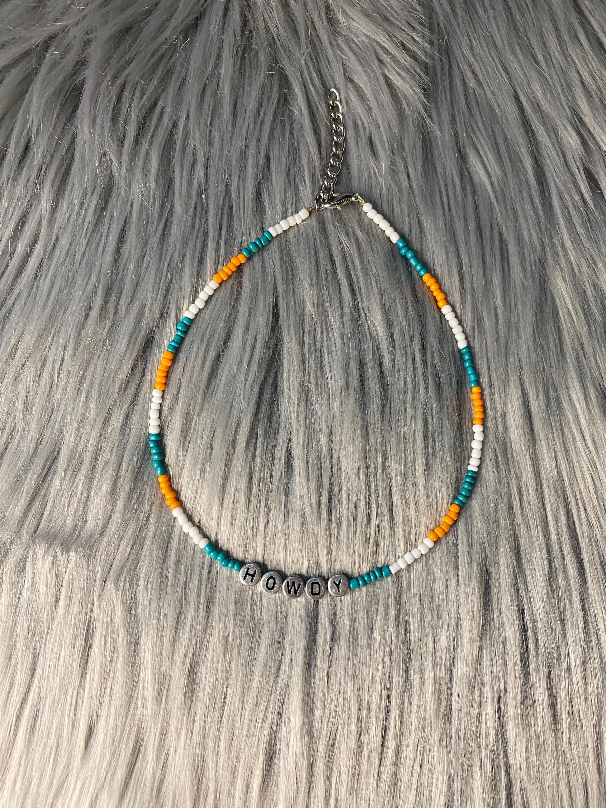 Choker and anklet are made from white, turquoise and orange glass beads. “Howdy” is spelled out in plastic metallic coated anagram beads. Strung on beading wire secured with clamp beads. Closure consists of a lobster claw clasp and adjustable length is thanks to high quality jewelry chain.