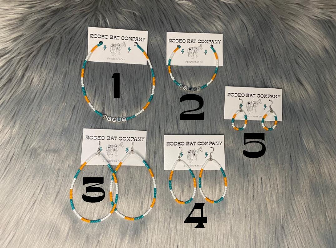 Our “Howdy” jewelry pattern comes in a choker, anklet, large tear hoops, medium tear hoops, small tear hoops and a jewelry set.