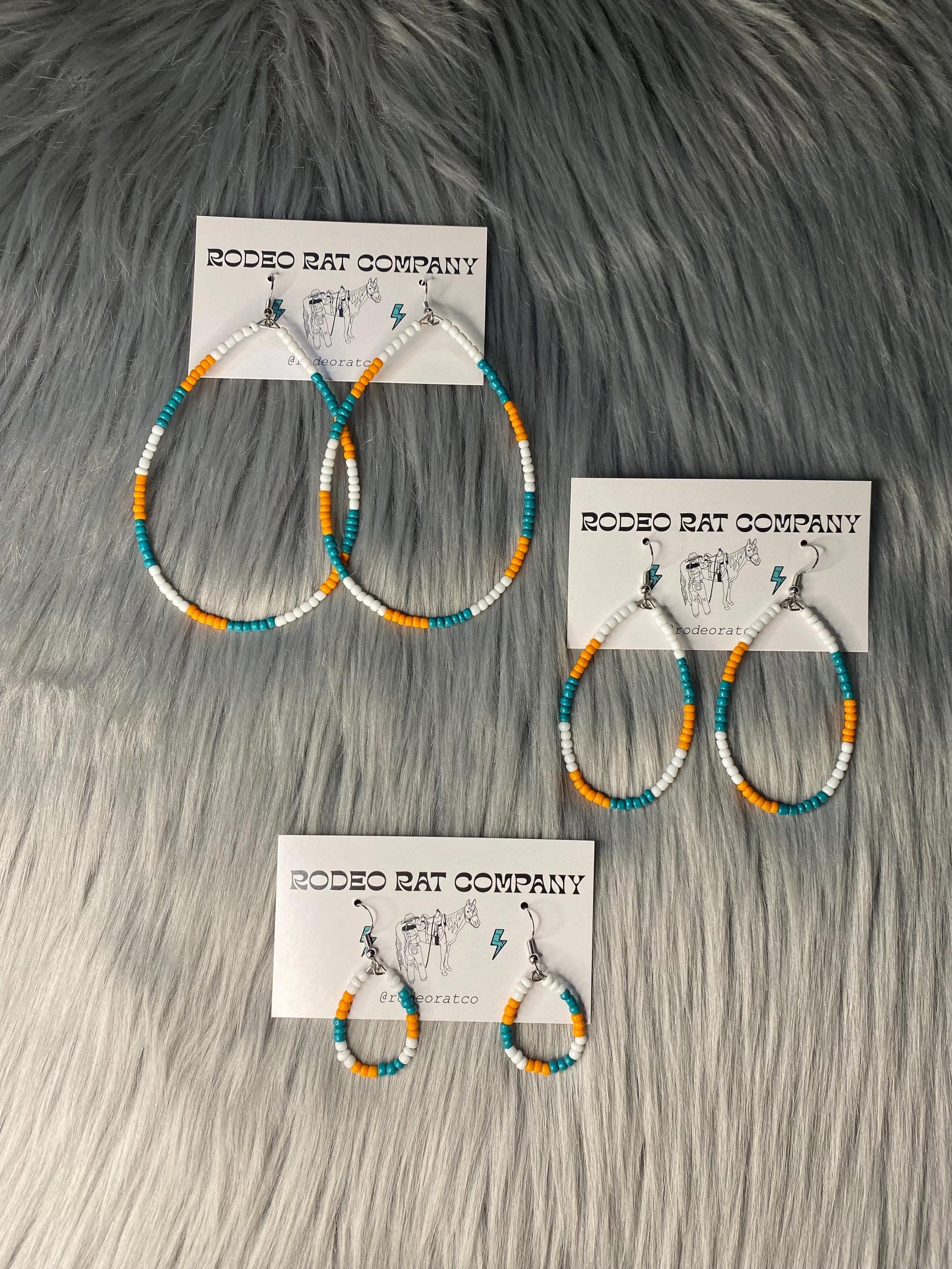 Tear hoops are made from white, turquoise and orange glass beads. Strung on beading wire secured with ear wire for closure.