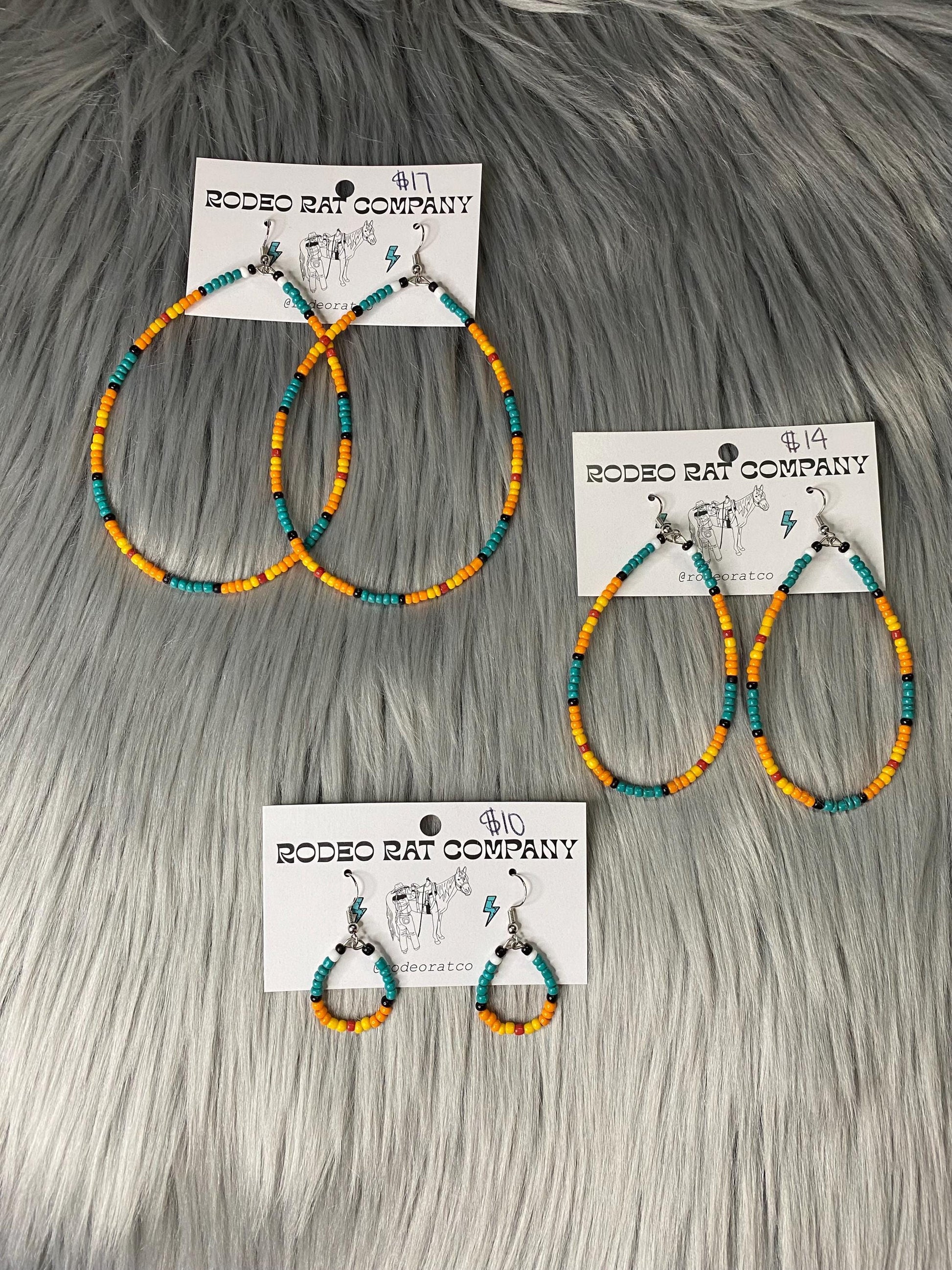 Tear hoops are made from black, white, turquoise, orange, red and yellow glass beads strung on beading wire secured with ear wire for closure.