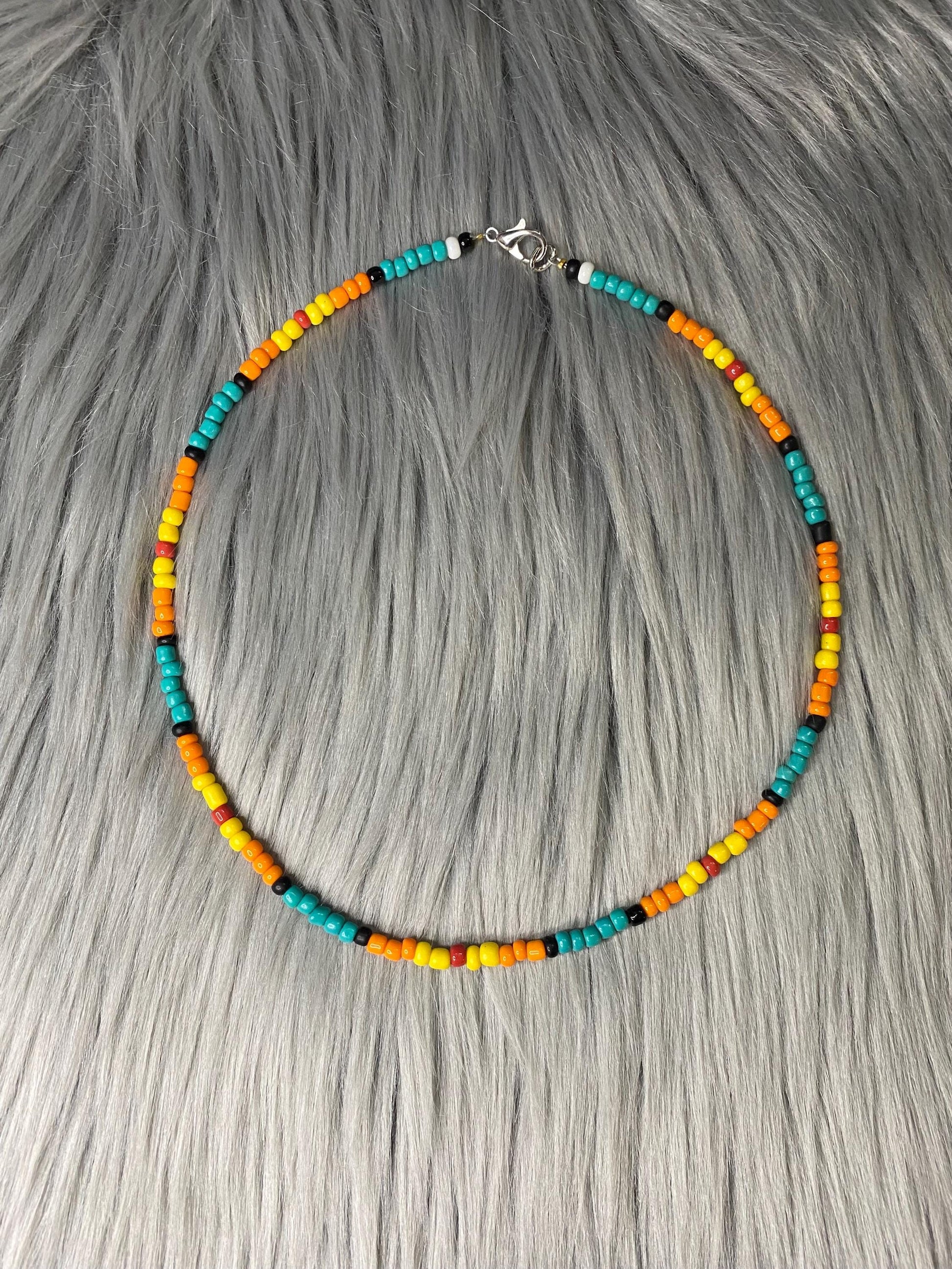 Necklace, choker and anklet are made from black, white, turquoise, orange, red and yellow glass beads. Strung on beading wire secured with clamp beads. Closure consists of a lobster claw clasp and adjustable length is thanks to high quality jewelry chain.