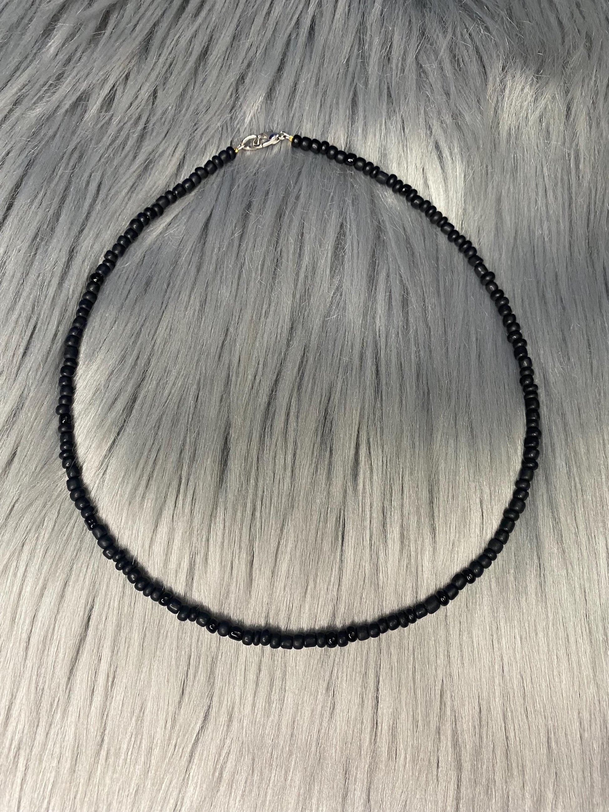Necklace, choker and anklet are made from black glass beads. Strung on beading wire secured with clamp beads. Closure consists of a lobster claw clasp and adjustable length is thanks to high quality jewelry chain.