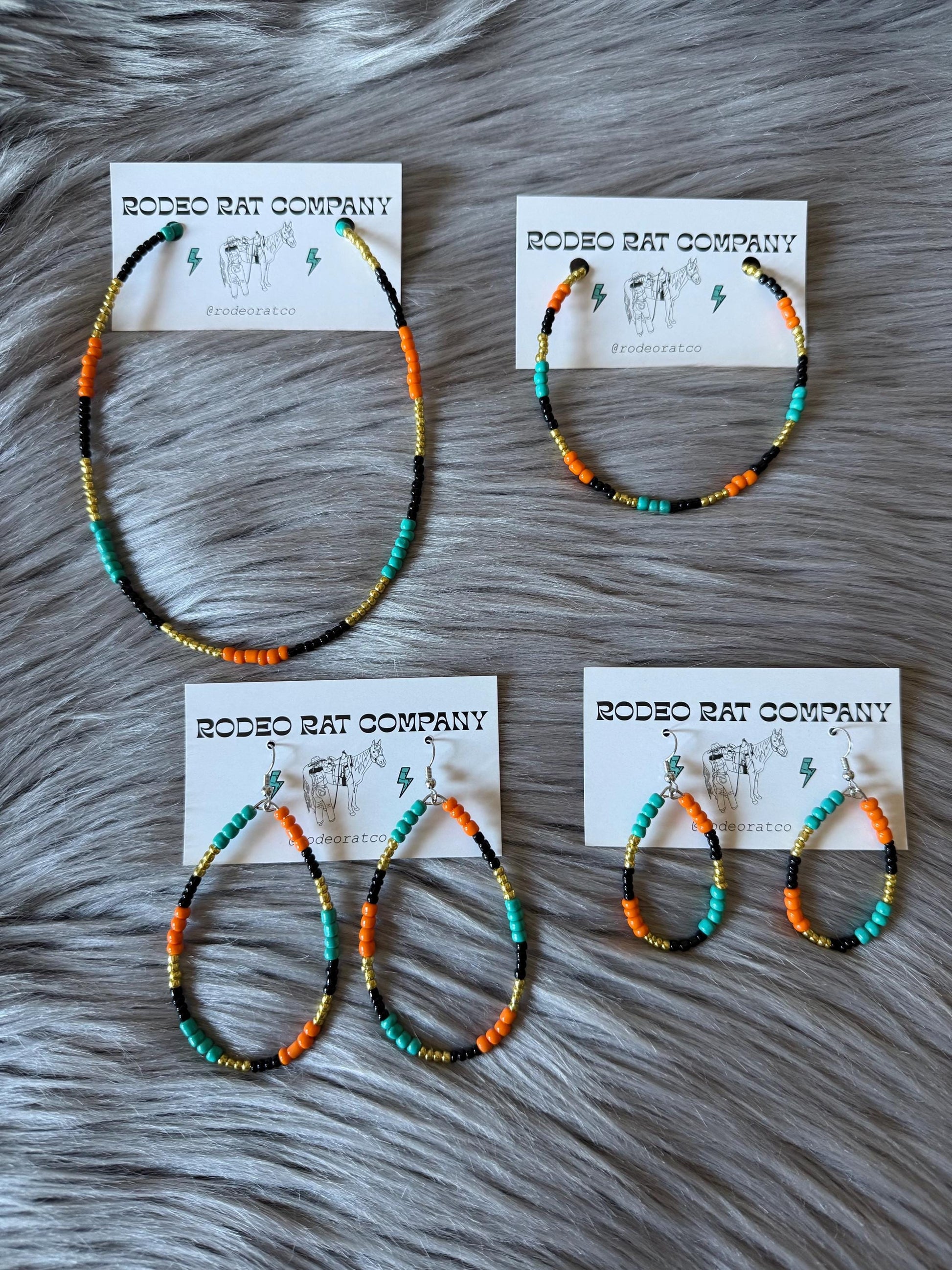 Tear hoops are made from gold, turquoise, orange and black glass beads. Strung on beading wire cleared with ear wire for closure.