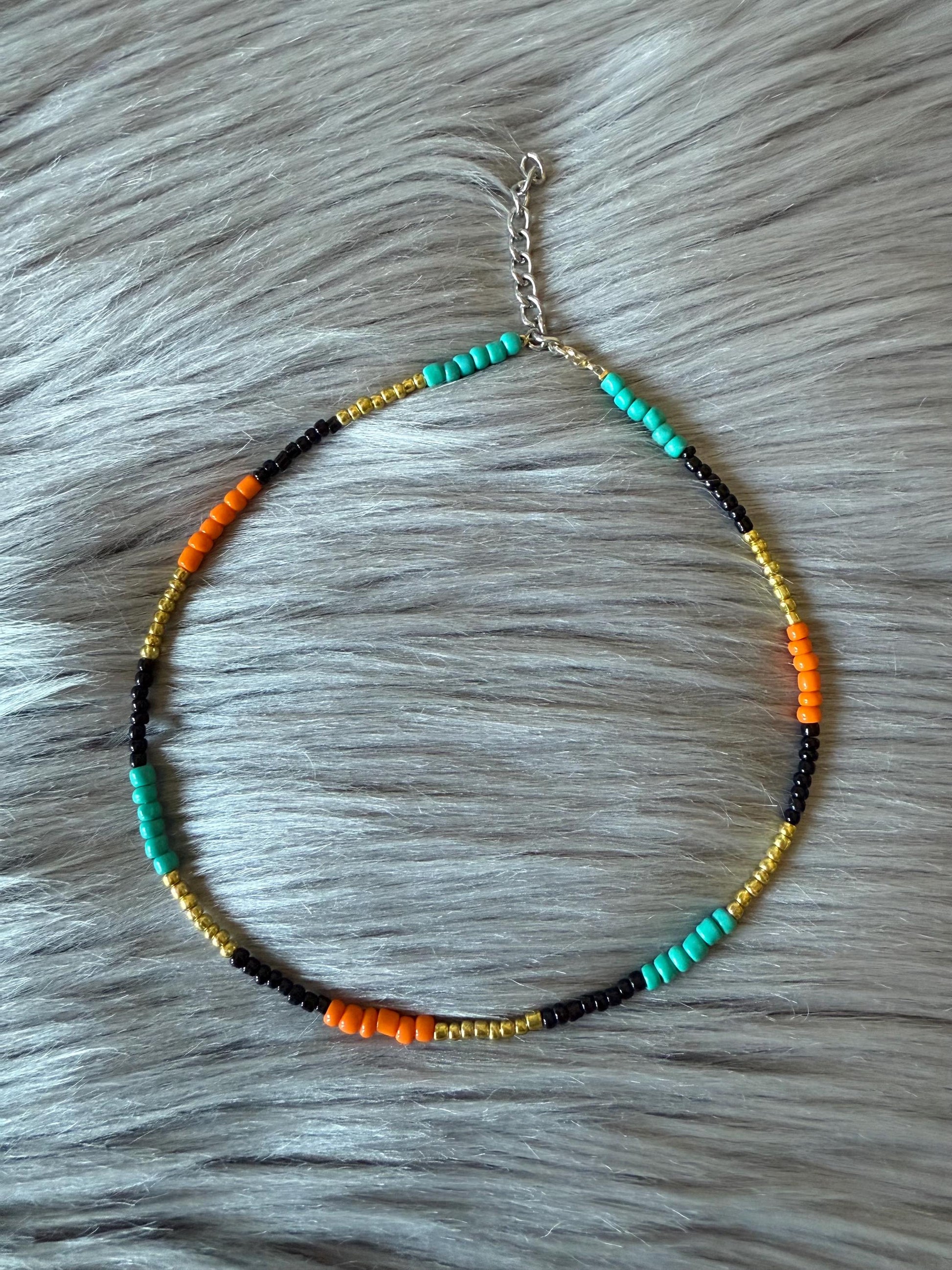 Choker and anklet are made from gold, turquoise, orange and black glass beads. Strung on beading wire secured with clamp beads. Closure consists of a lobster claw clasp and adjustable length is thanks to high quality jewelry chain.
