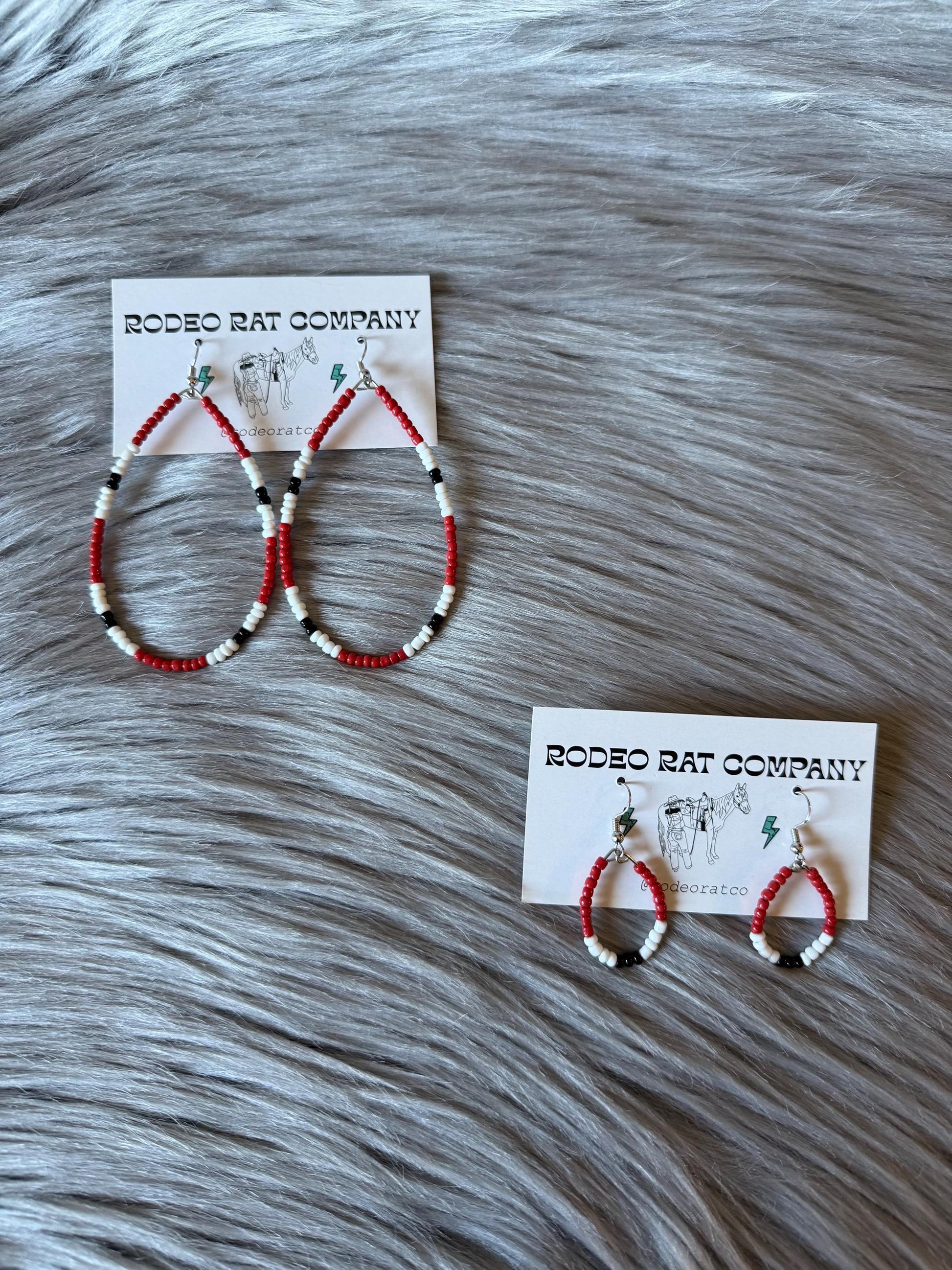 Tear hoops are made from red, white and black glass beads. Strung on beading wire secured with ear wire for closure.