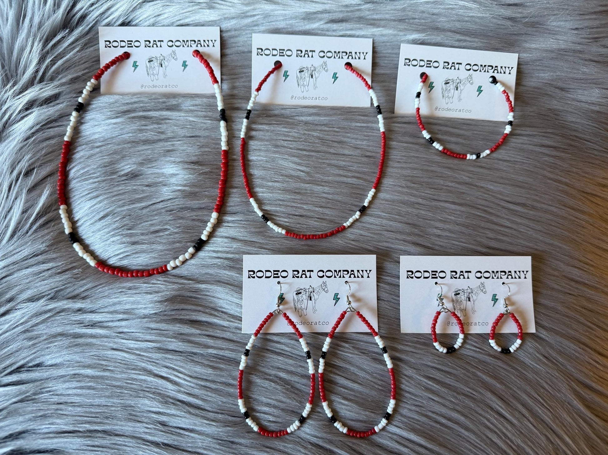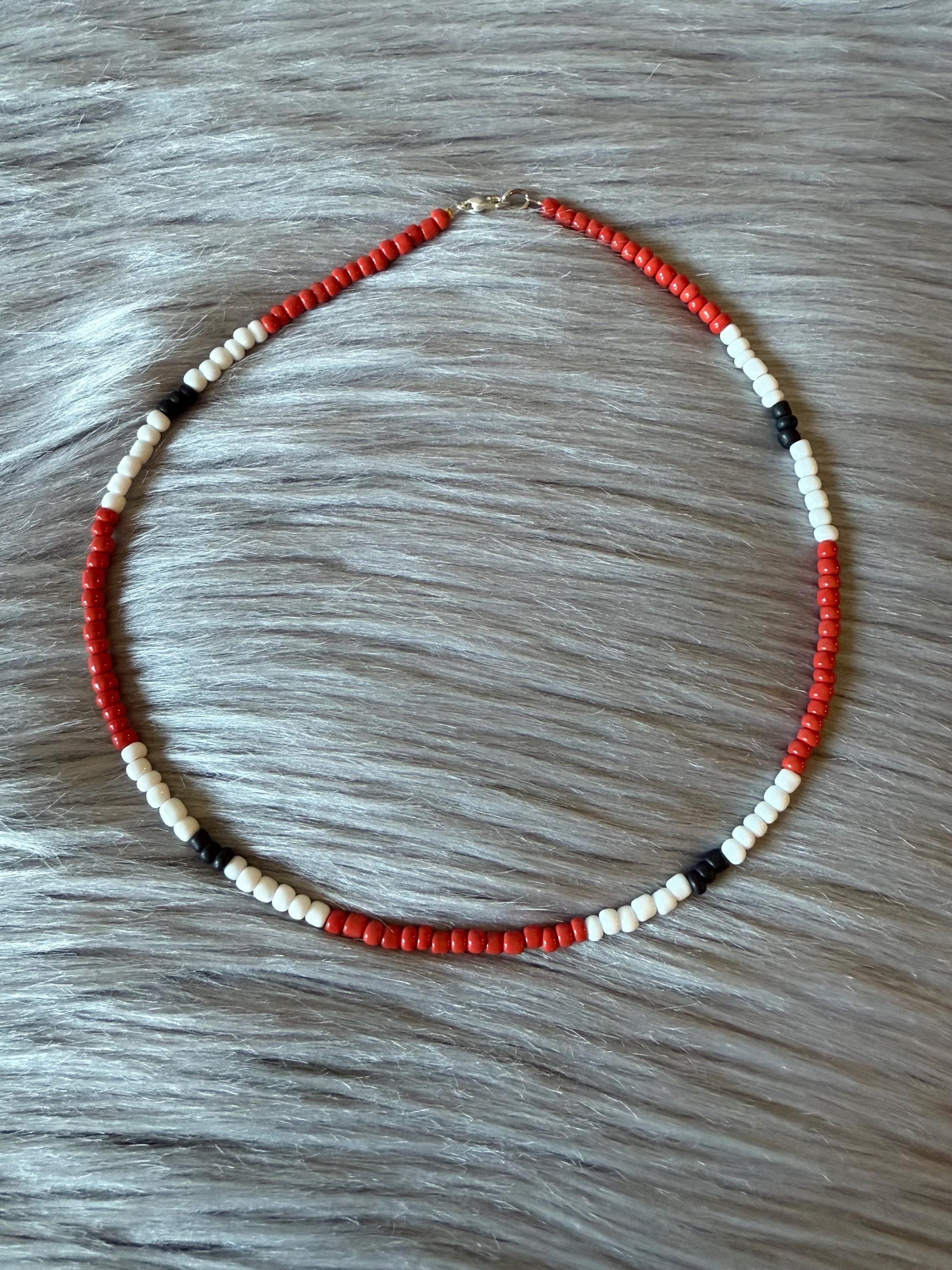 Necklace, choker and anklet are made from red, white and black glass beads. Strung on beading wire secured with clamp beads. Closure consists of a lobster claw clasp and adjustable length is thanks to high quality jewelry chain.