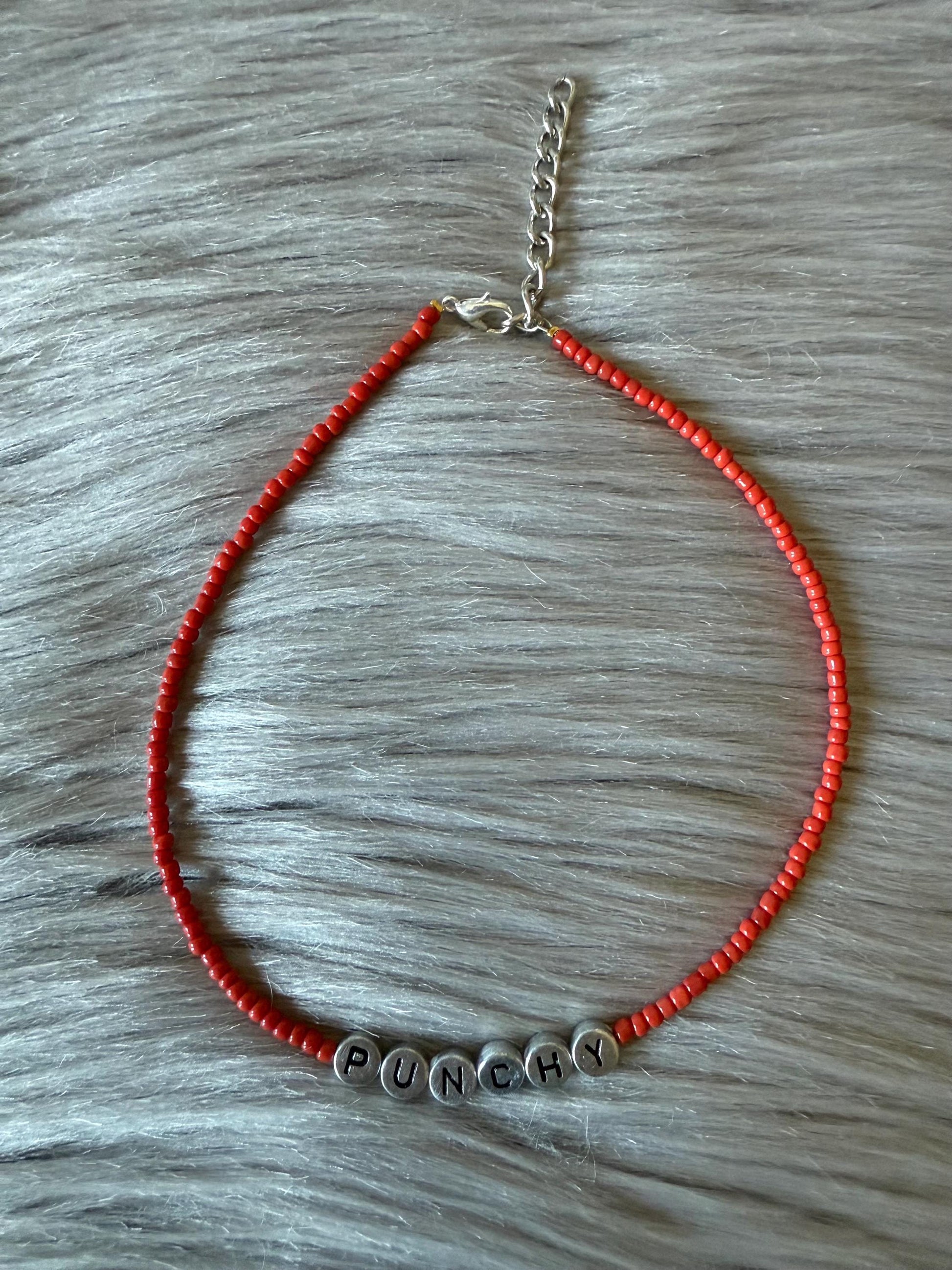 Choker and anklet are made from red glass beads and metallic coated letter beads to form the word “punchy”. Strung on beading wire secured with clamp beads. Closure consists of a lobster claw clasp and adjustable length is thanks to high quality jewelry chain.