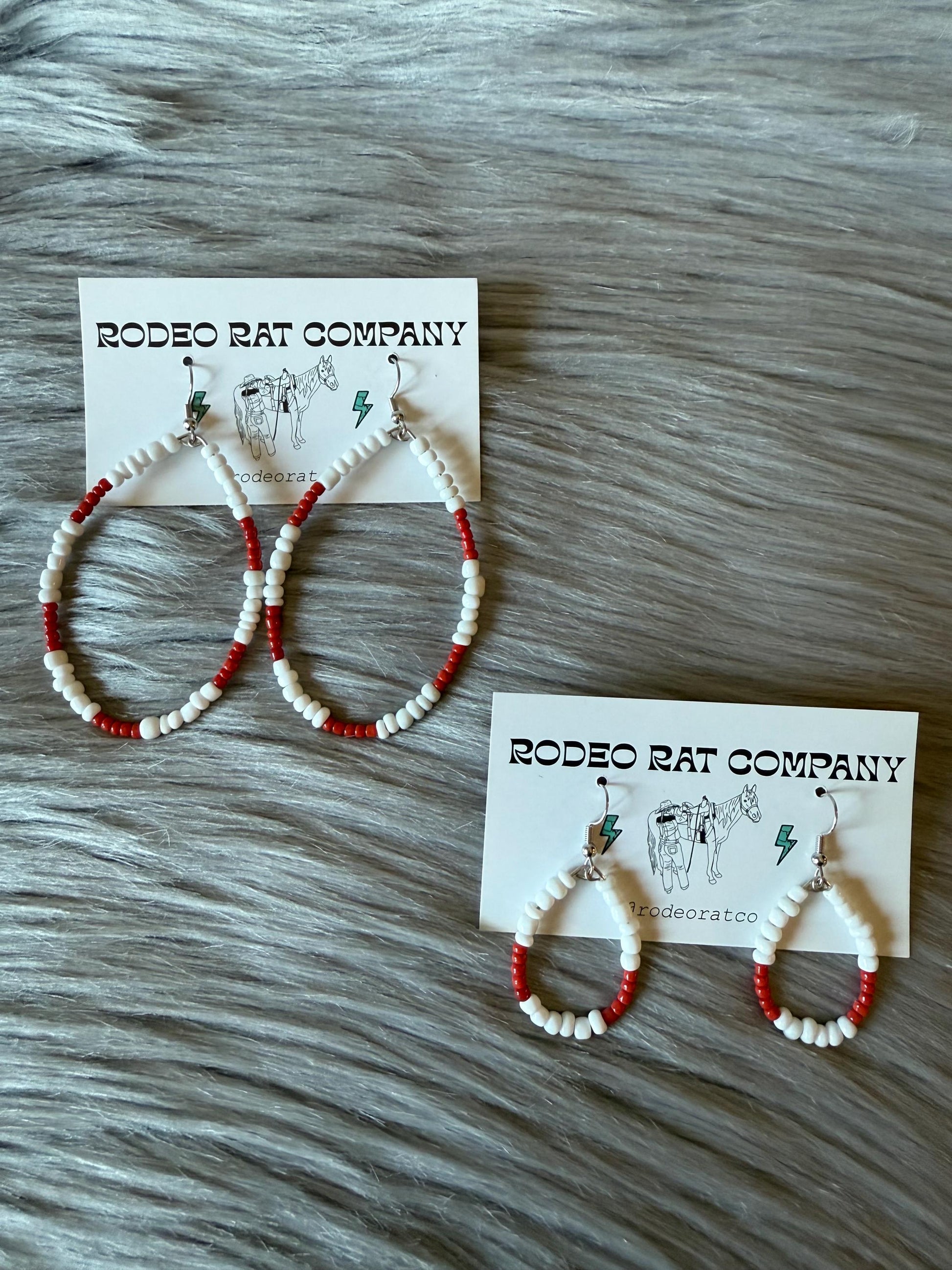 Tear hoops are made from white and red glass beads. Strung on beading wire secured with ear wire for closure.