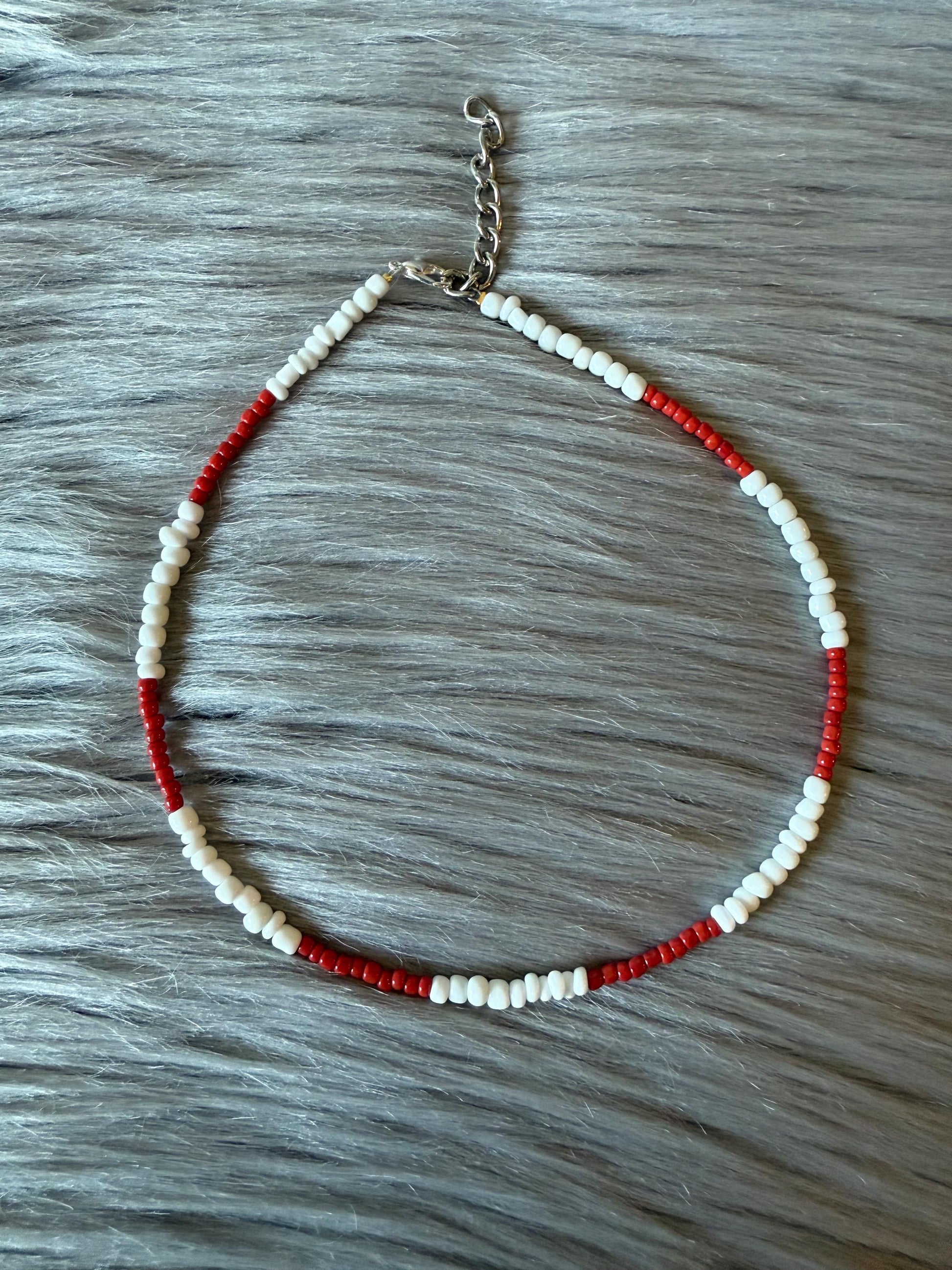 Choker and anklet are made from white and red glass beads. Strung on beading wire secured with clamp beads. Adjustable length is thanks to high quality jewelry chain and closure consists of a lobster claw clasp.