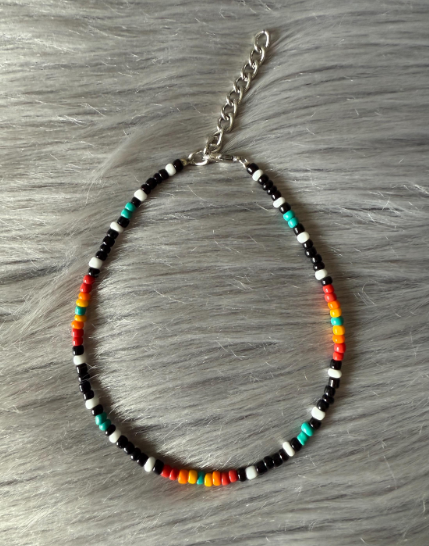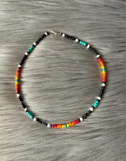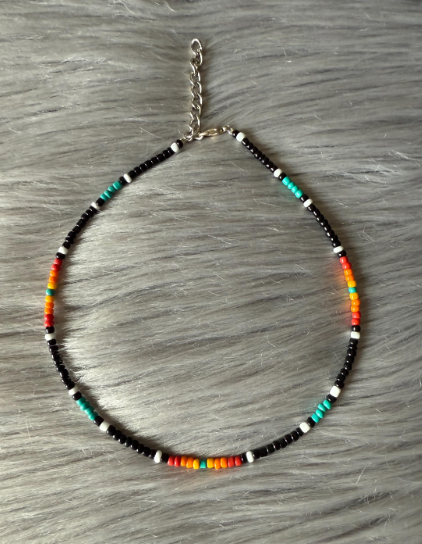 Necklace, choker and anklet are made from black, white, turquoise, red, orange and yellow glass beads. Strung on beading wire secured with clamp beads. Closure consists of a lobster claw clasp and adjustable length is thanks to high quality jewelry chain.