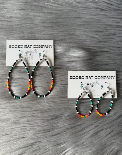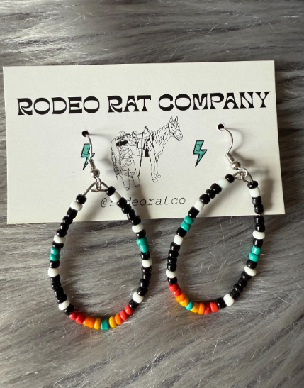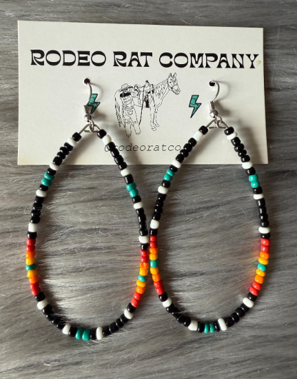 Tear hoops are made from black, white, turquoise, red, orange and yellow glass beads. Strung on beading wire secured with ear wire for closure.