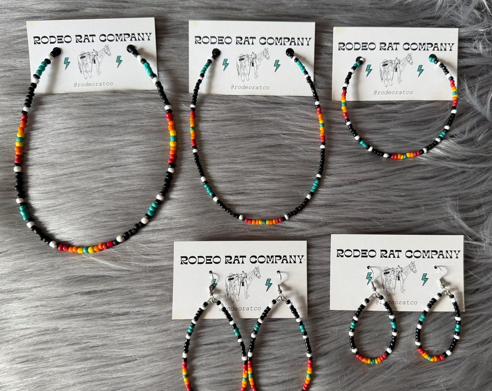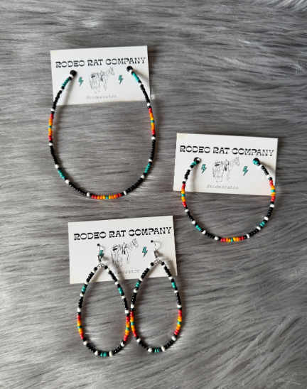 Our “Ropin’ Necks” pattern comes in a necklace, choker, anklet, medium tear hoops, small tear hoops and a jewelry set.