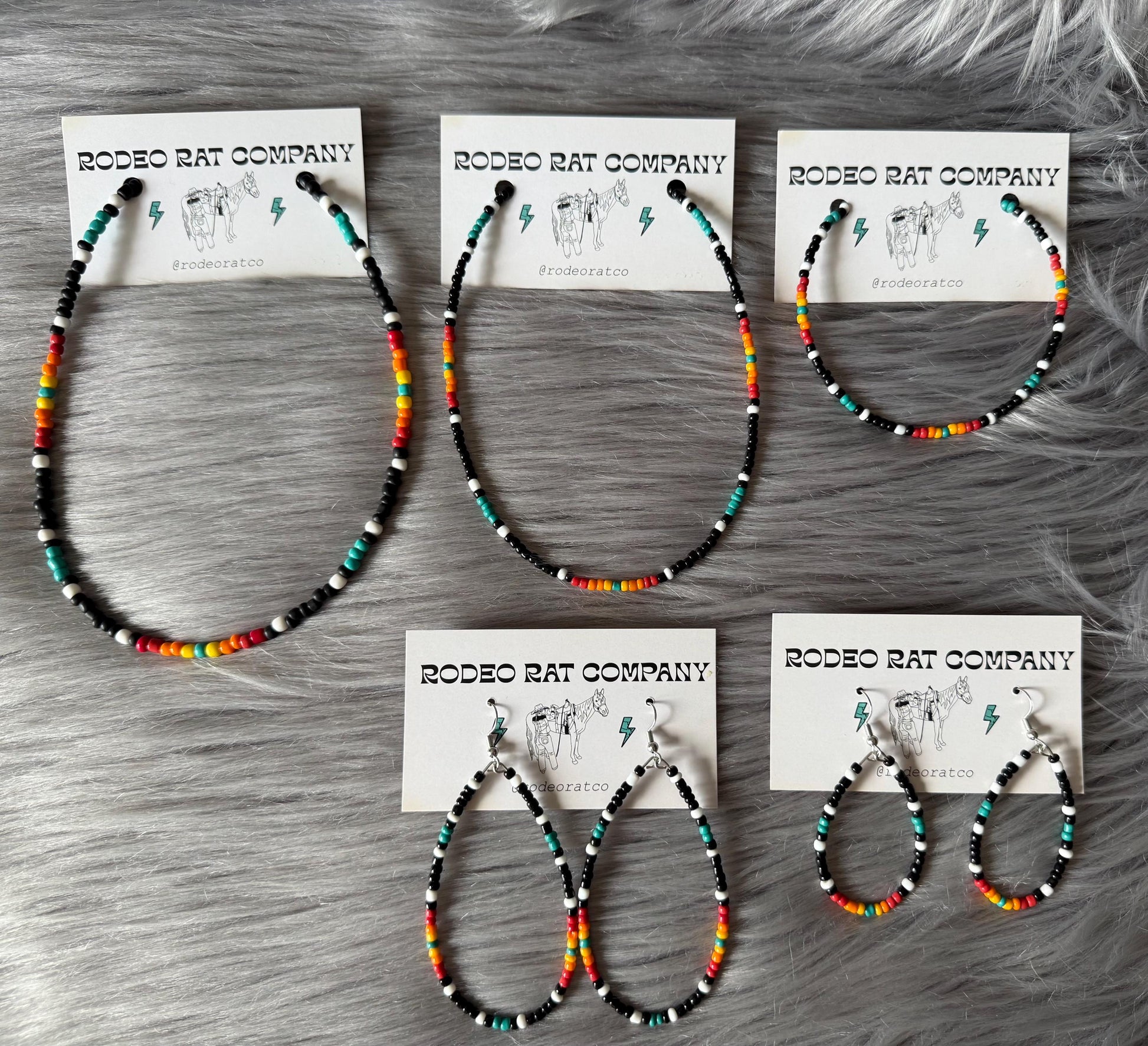 Our “Ropin’ Necks” pattern comes in a necklace, choker, anklet, medium tear hoops, small tear hoops and a jewelry set.