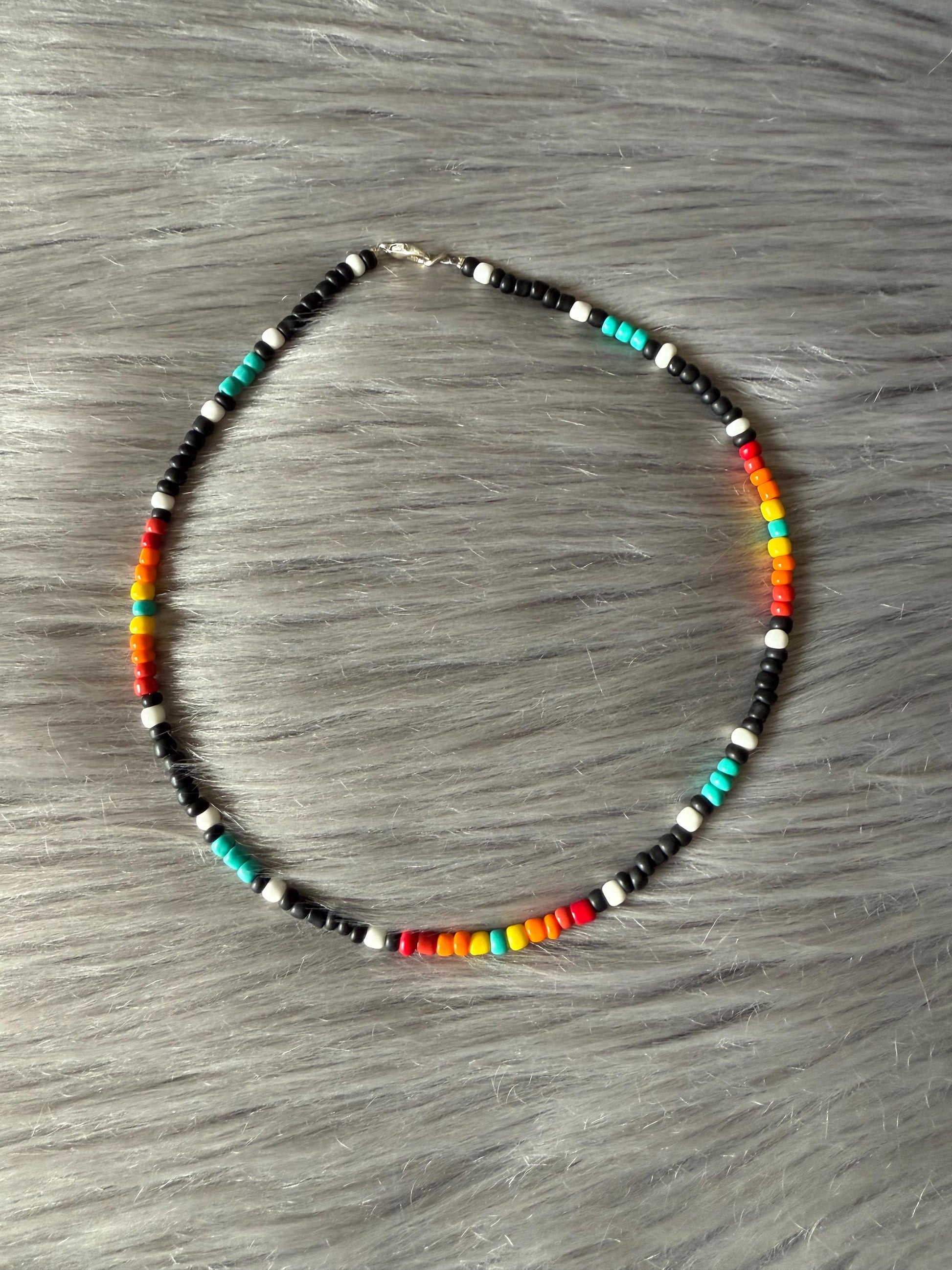 Necklace, choker and anklet are made from black, white, turquoise, red, orange and yellow glass beads. Strung on beading wire secured with clamp beads. Closure consists of a lobster claw clasp and adjustable length is thanks to high quality jewelry chain.