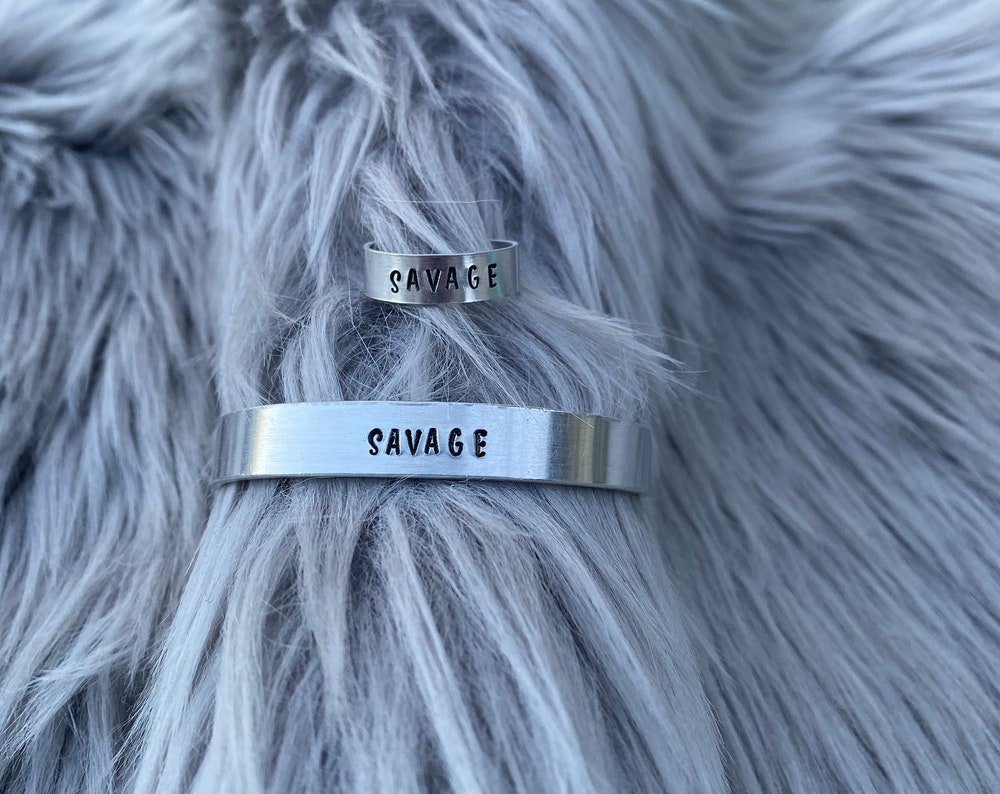 Our Savage stamped jewelry comes in a ring, bracelet and the set of both.