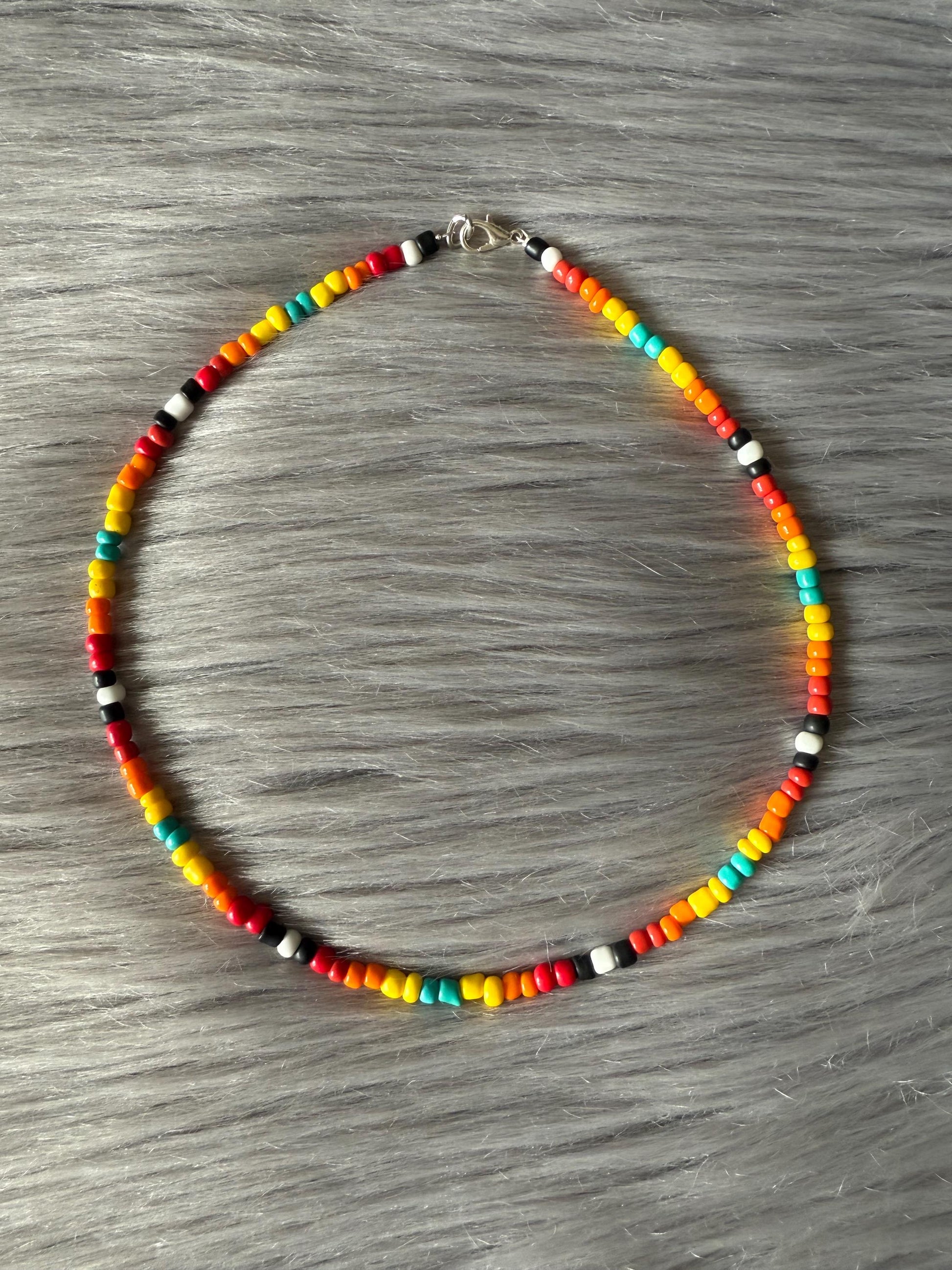 Necklace, choker and anklet are made from black, white, red, orange, yellow and turquoise glass beads. Strung on beading wire secured with clamp beads. Closure consists of a lobster claw clasp and adjustable length is thanks to high quality jewelry chain.