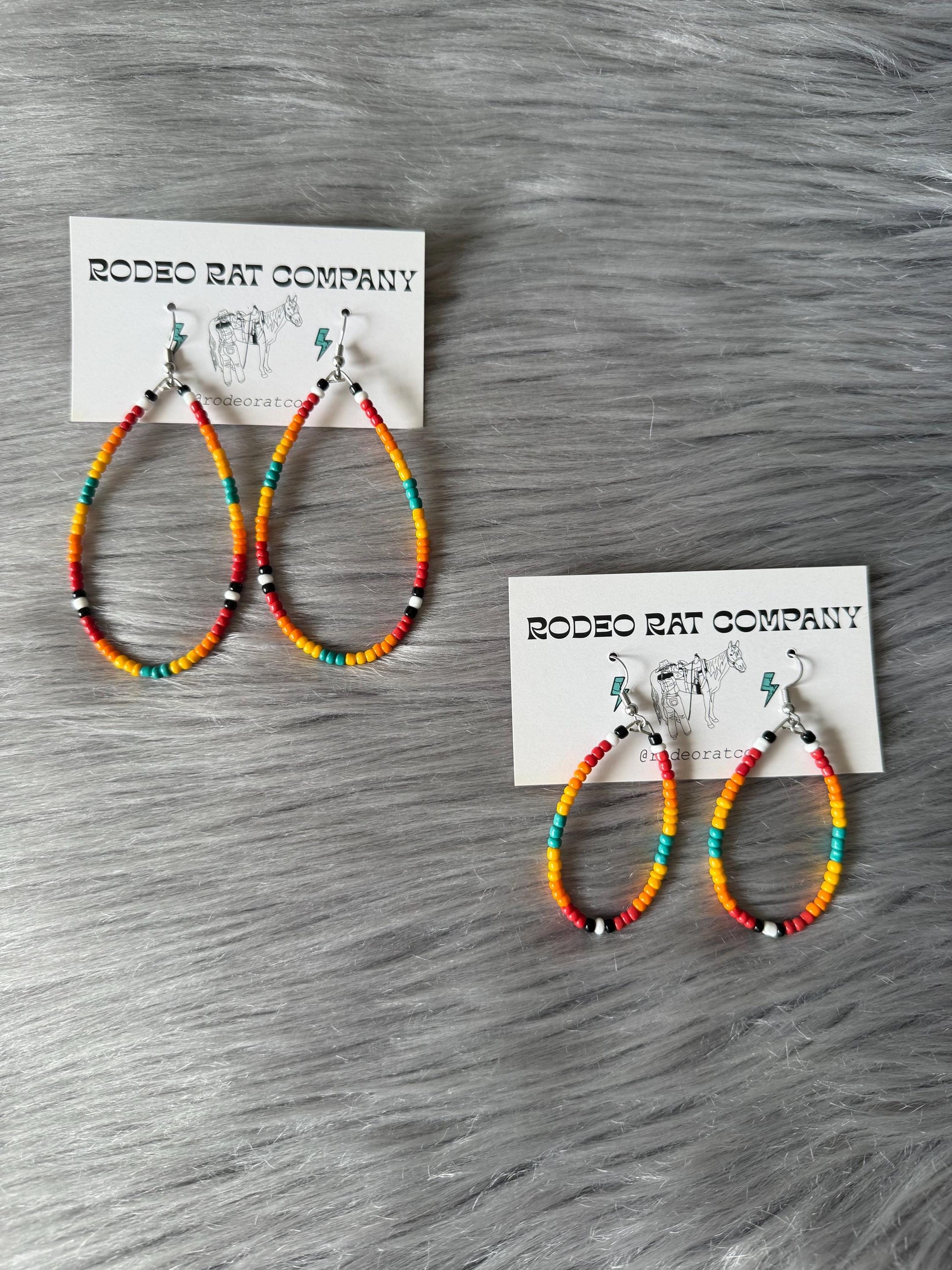 Tear hoops are made from black, white, red, orange, yellow and turquoise glass beads. Strung on beading wire secured with ear wire for closure.