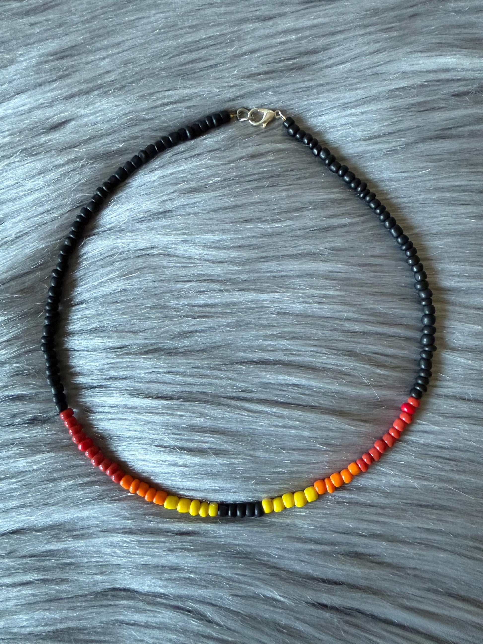 Necklace, choker and anklet are made from black, red, orange and yellow glass beads. Strung on beading wire secured with clamp beads. Closure consists of a lobster claw clasp and adjustable length is thanks to high quality jewelry chain.