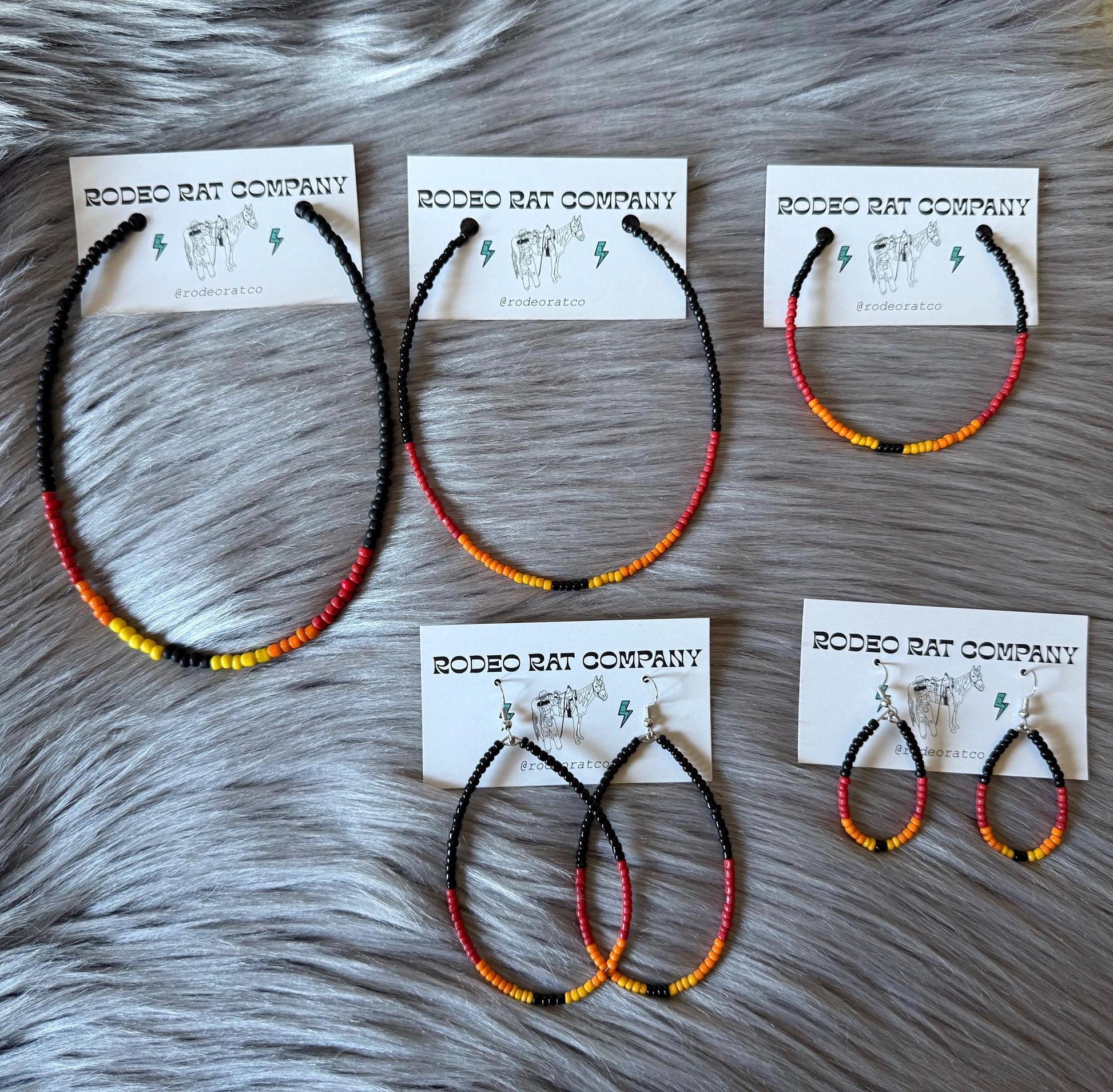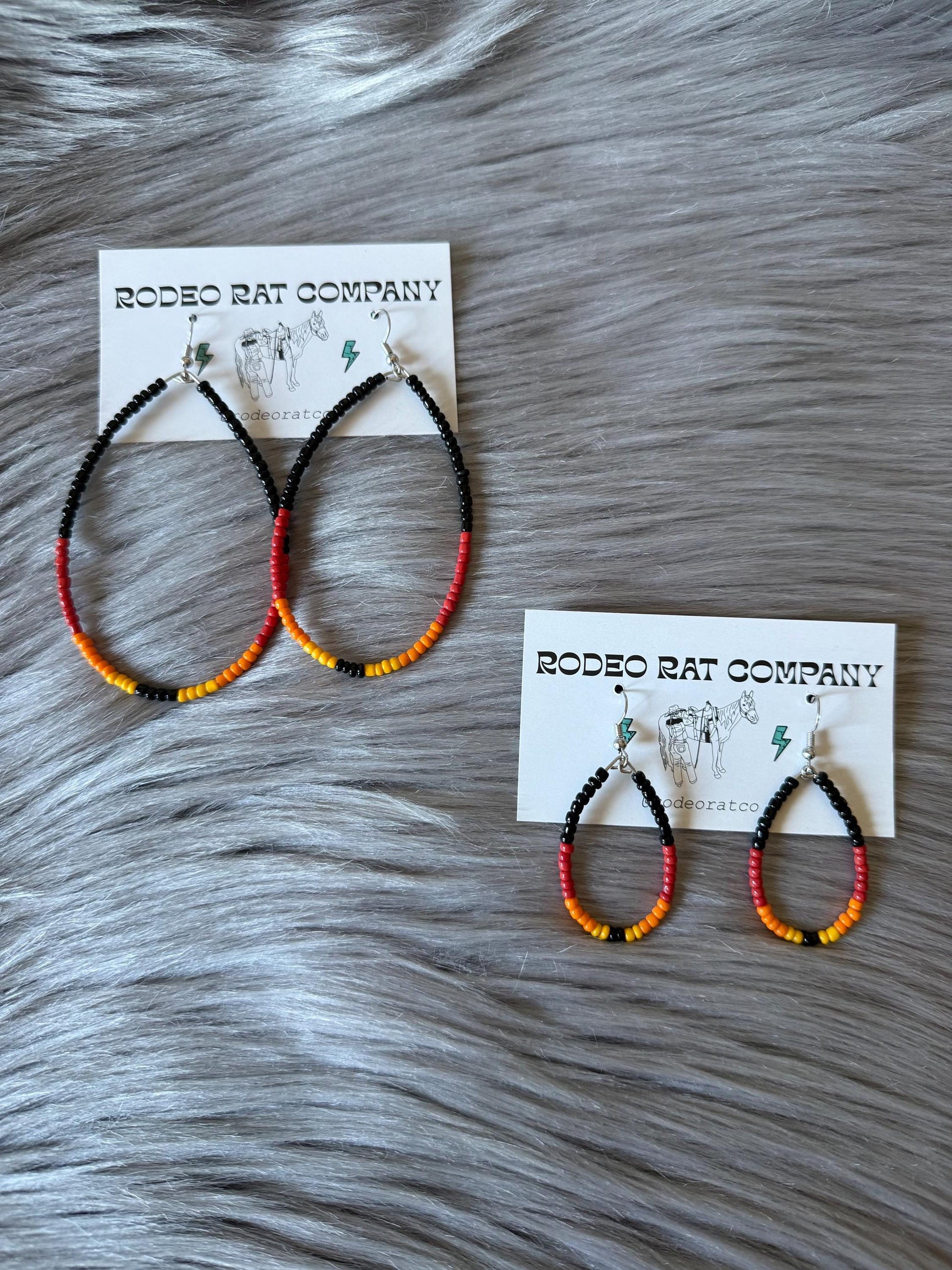 Tear hoops are made from black, red, orange and yellow glass beads. Strung on beading wire secured with ear wire for closure.