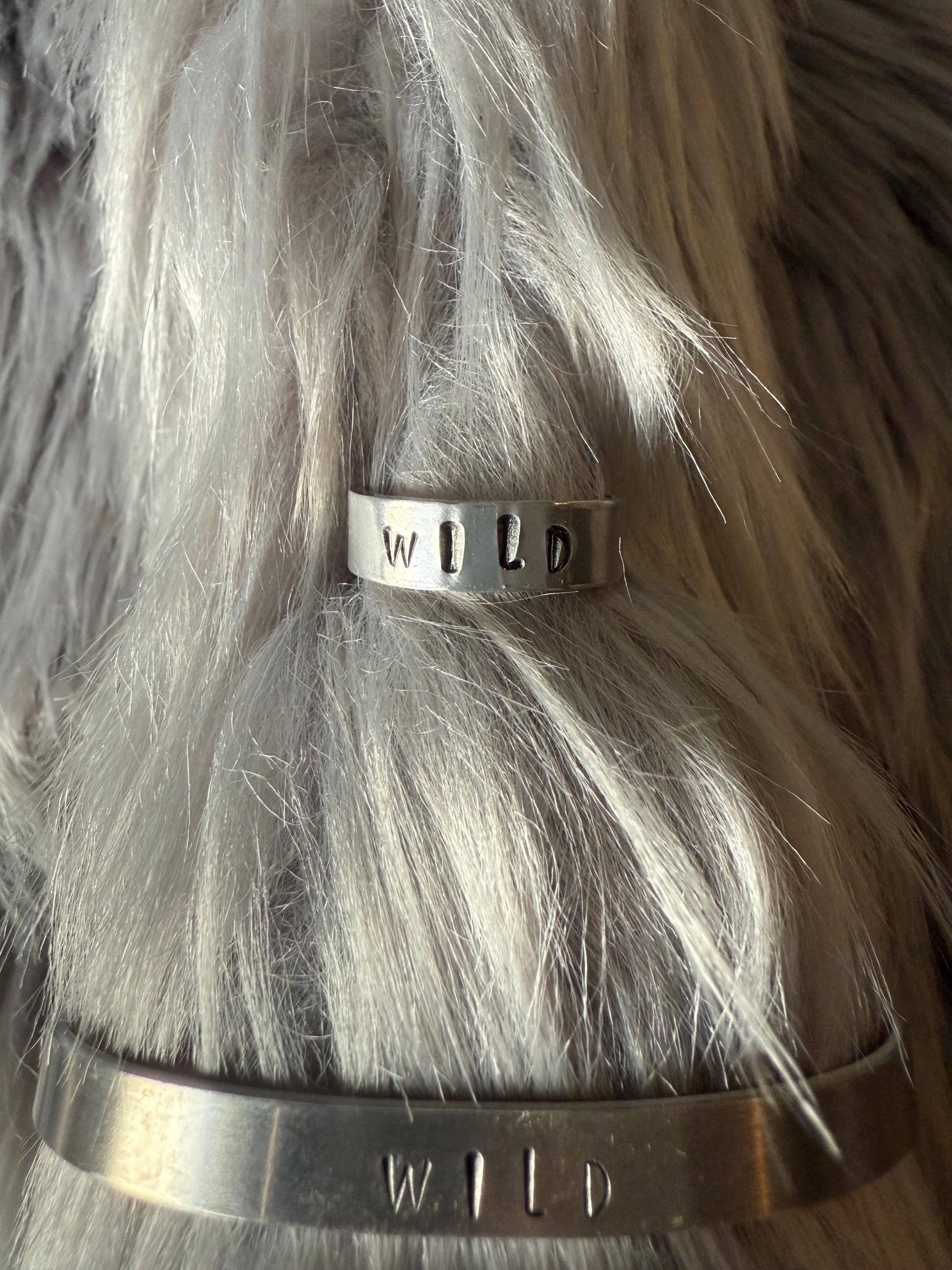 Our “Wild” stamped jewelry comes in a ring, bracelet and set. Pieces are stamped with the work Wild. Bracelet and ring are made from stainless steel. The do give and can be formed to perfectly fit you!